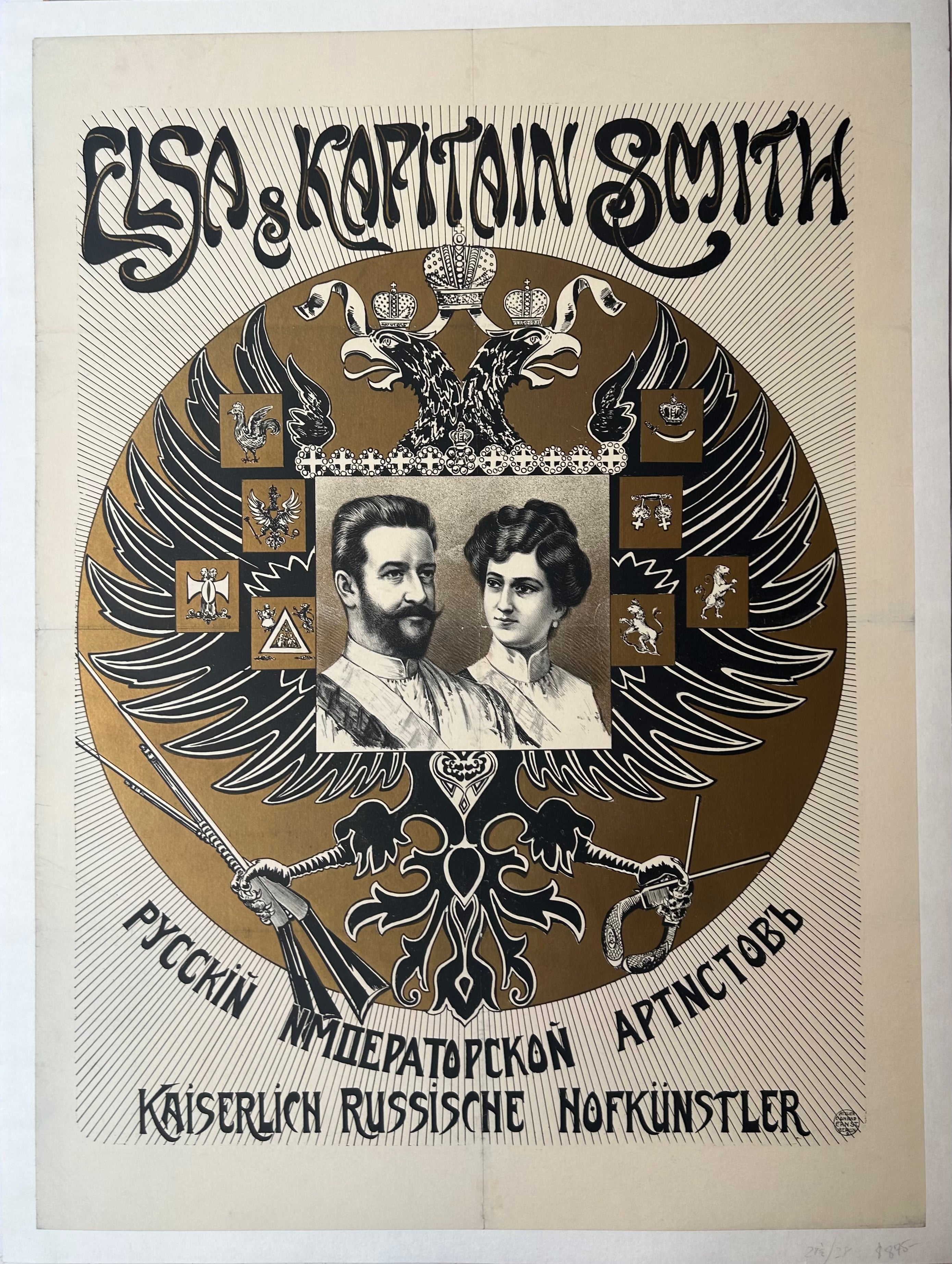 Vintage German poster on Russian subject matter, presenting two Russian imperial artists. The illustrations on this poster are rich in details, the small sketches along the eagles' wings an especially nice touch.