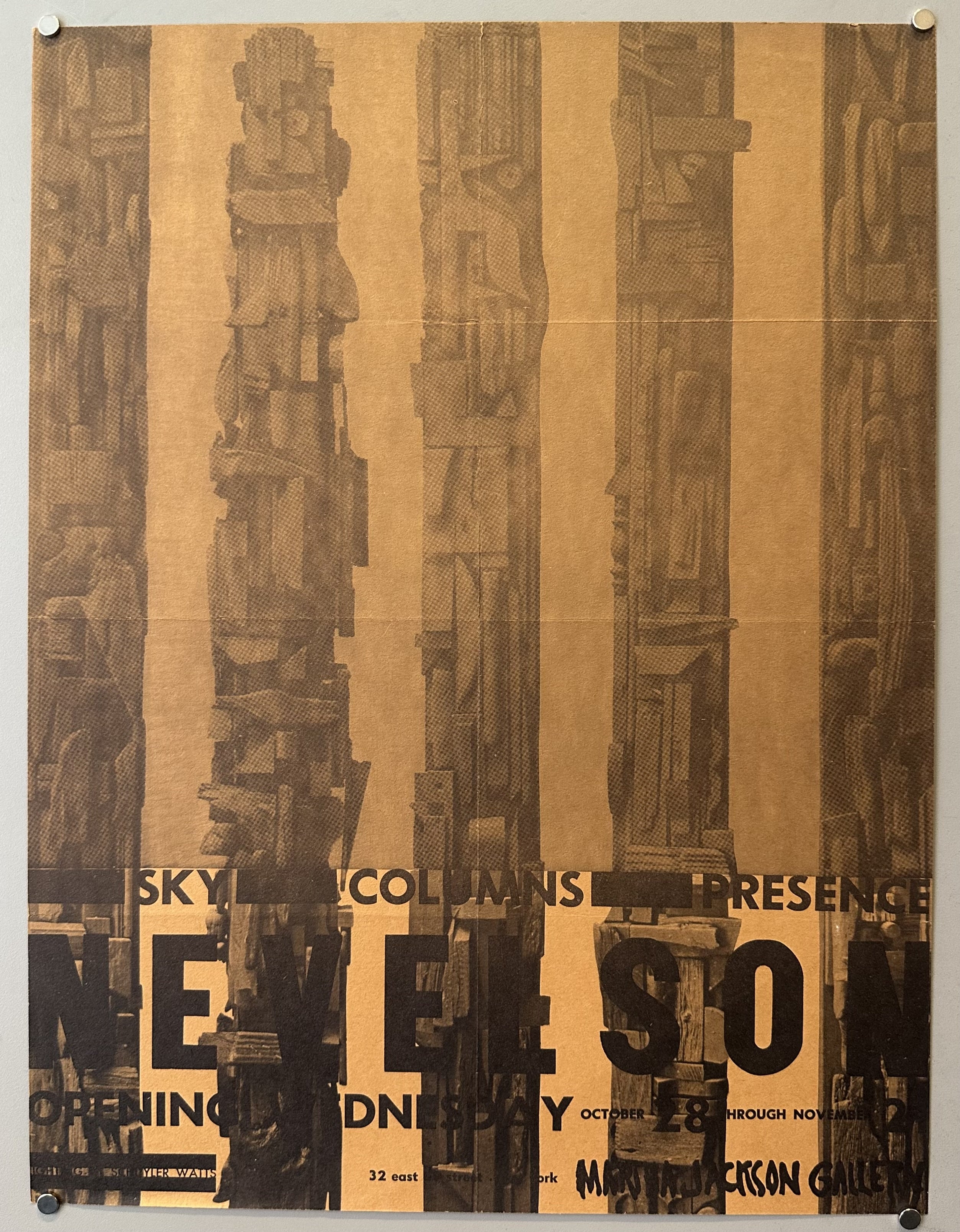 Art exhibtion poster for 1959 event "Sky Columns Presence" by artist Louise Nevelson at the Martha Jackson Gallery in New York. The exhibition featured Nevelson's sculptures, which were inspired by ancient Mayan art.