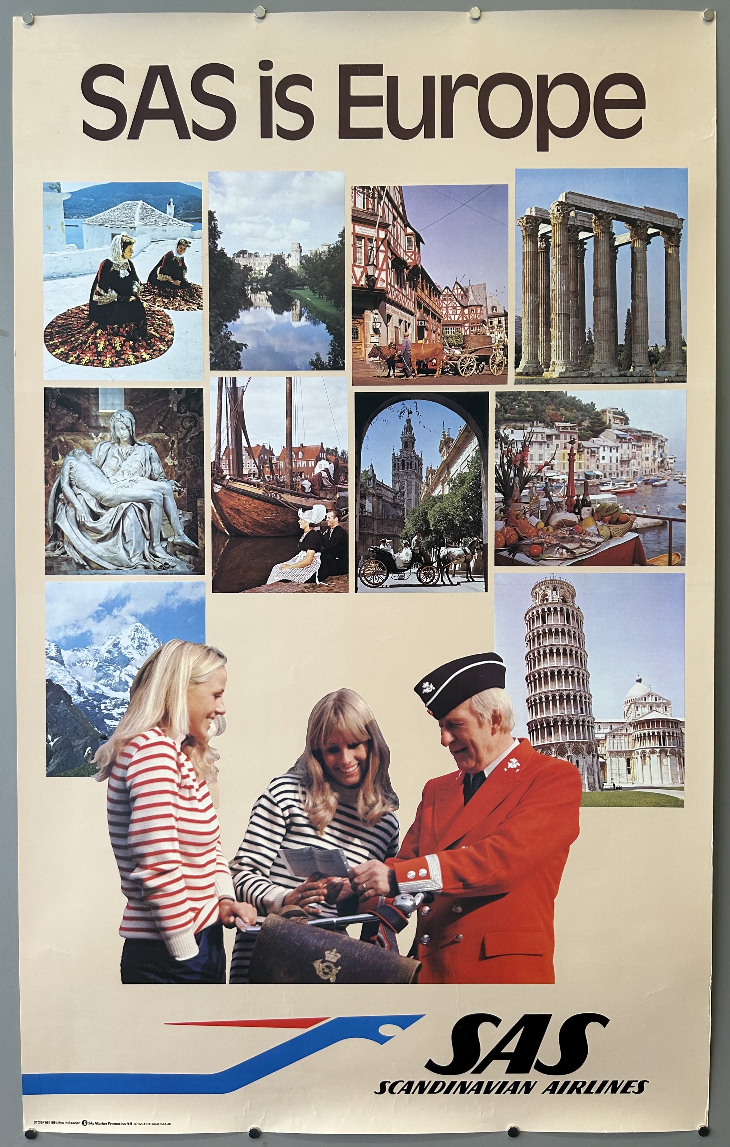 Vintage travel poster from SAS Airlines featuring various photographs of popular tourist attractions in Europe.