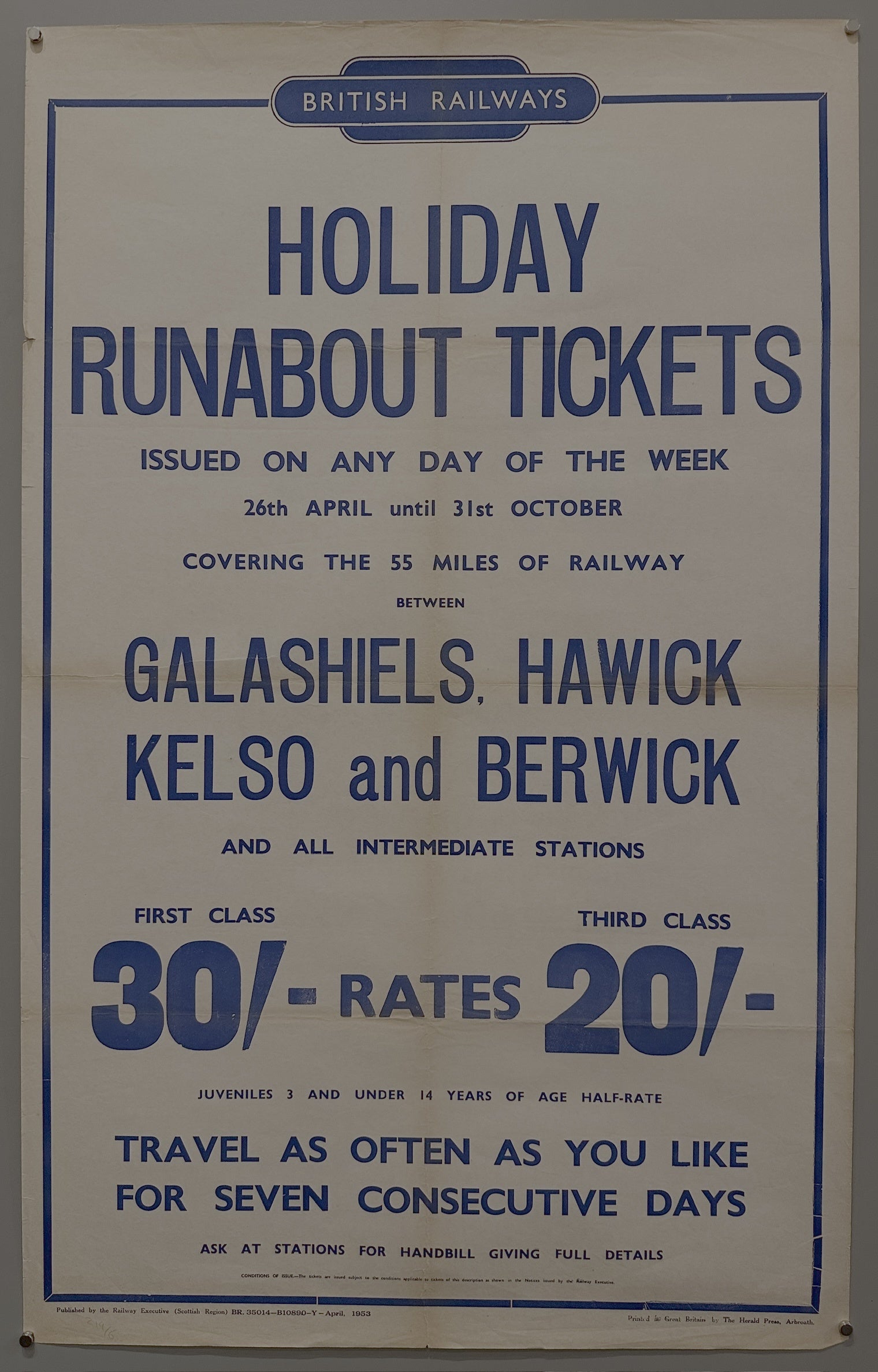 Original vintage British Railways poster advertising "Holiday Runabout Tickets". These tickets offered unlimited travel within a specific 55-mile area in Scotland for a set period during the holiday season.