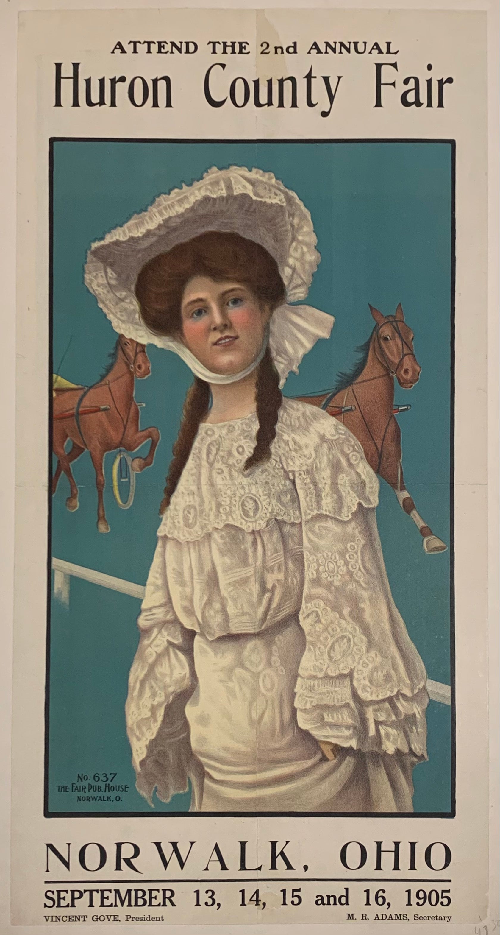Attend the 2nd annual Huron County Fair, in Norwalk Ohio. Poster features a girl in a bonnet and white dress standing in front of horses.