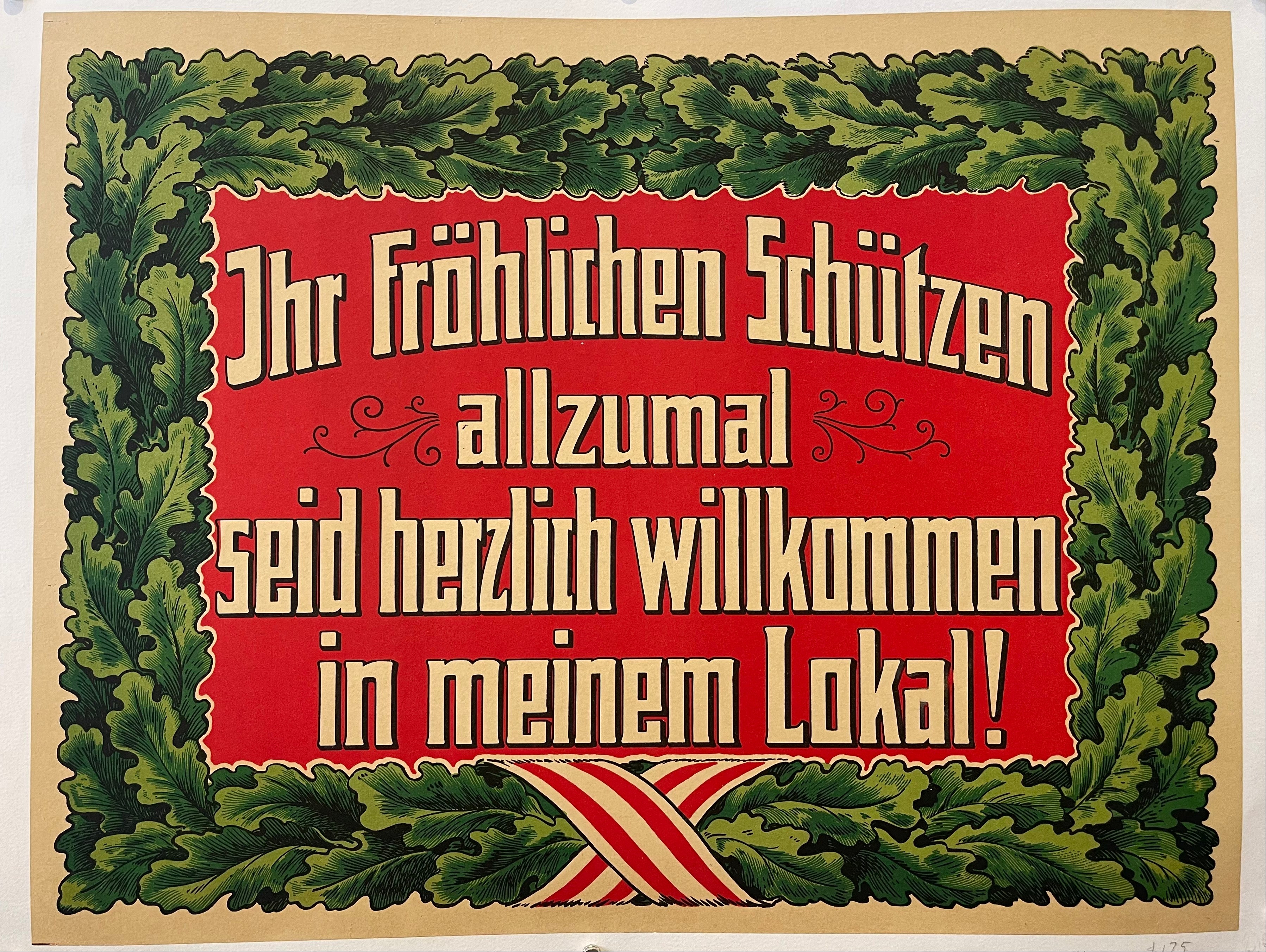A German sign that states 'Happy Shooters (Protectors)' are welcome in the resturant, or, Lokal. Complimented by a green leafy border and red background that creates a bold statement.