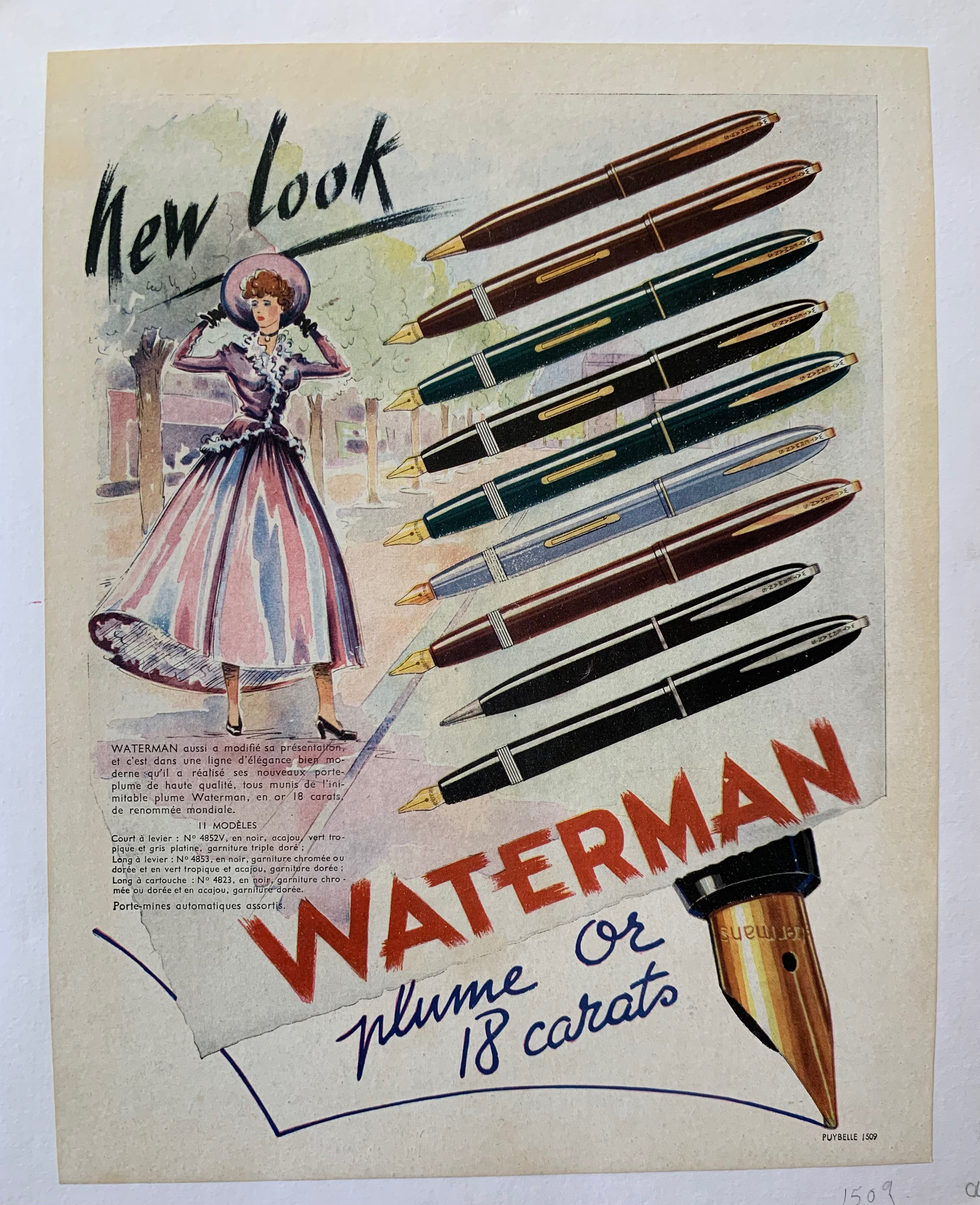 This vintage print ad is for Waterman Pens, a French luxury pen and ink brand. Today, Waterman Pens are quite valuable and are a great collector's item.