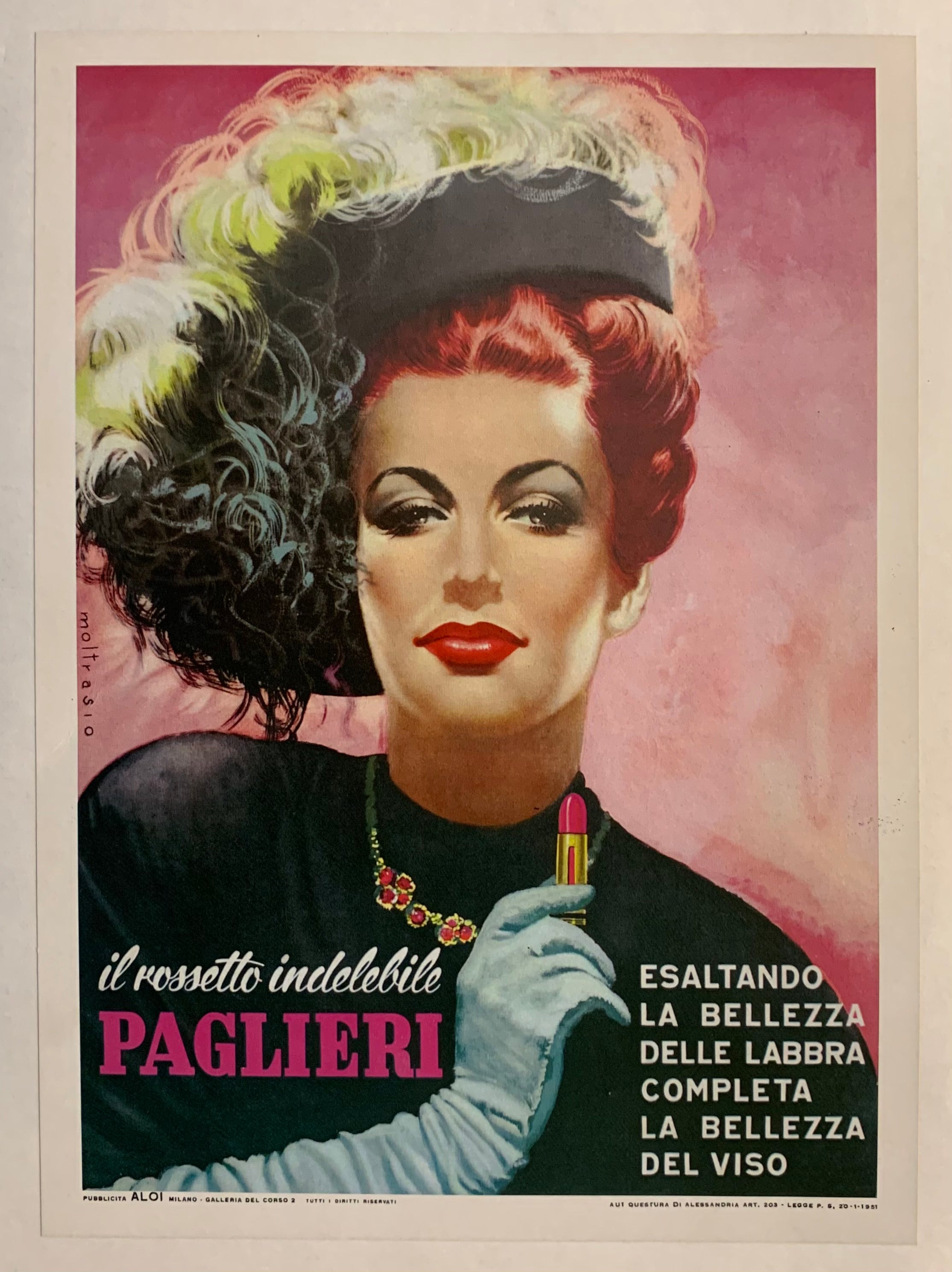 This stunning original poster advertises an Italian lipstick brand. A glam shot of a woman in an extravagent hat shows the luxury of the lipstick.