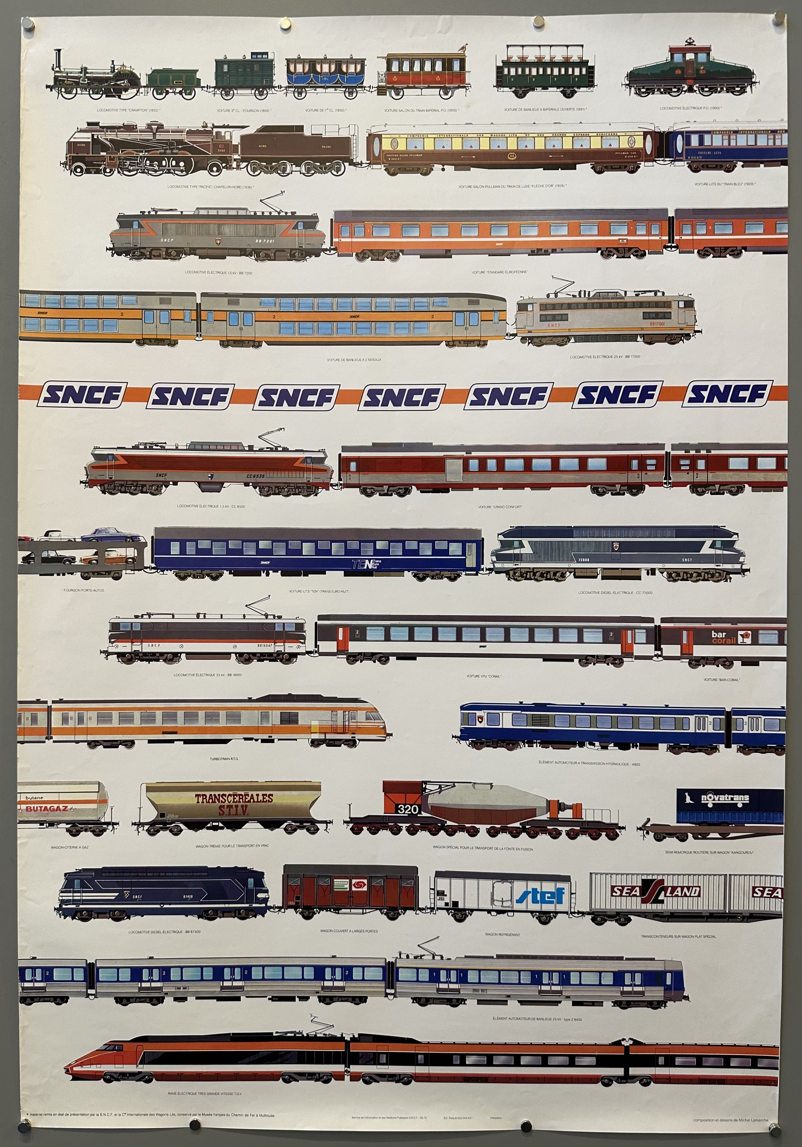 Various SNCF trains, locomotives, wagons, and cars are illustrated in this poster with the model written underneath each.
