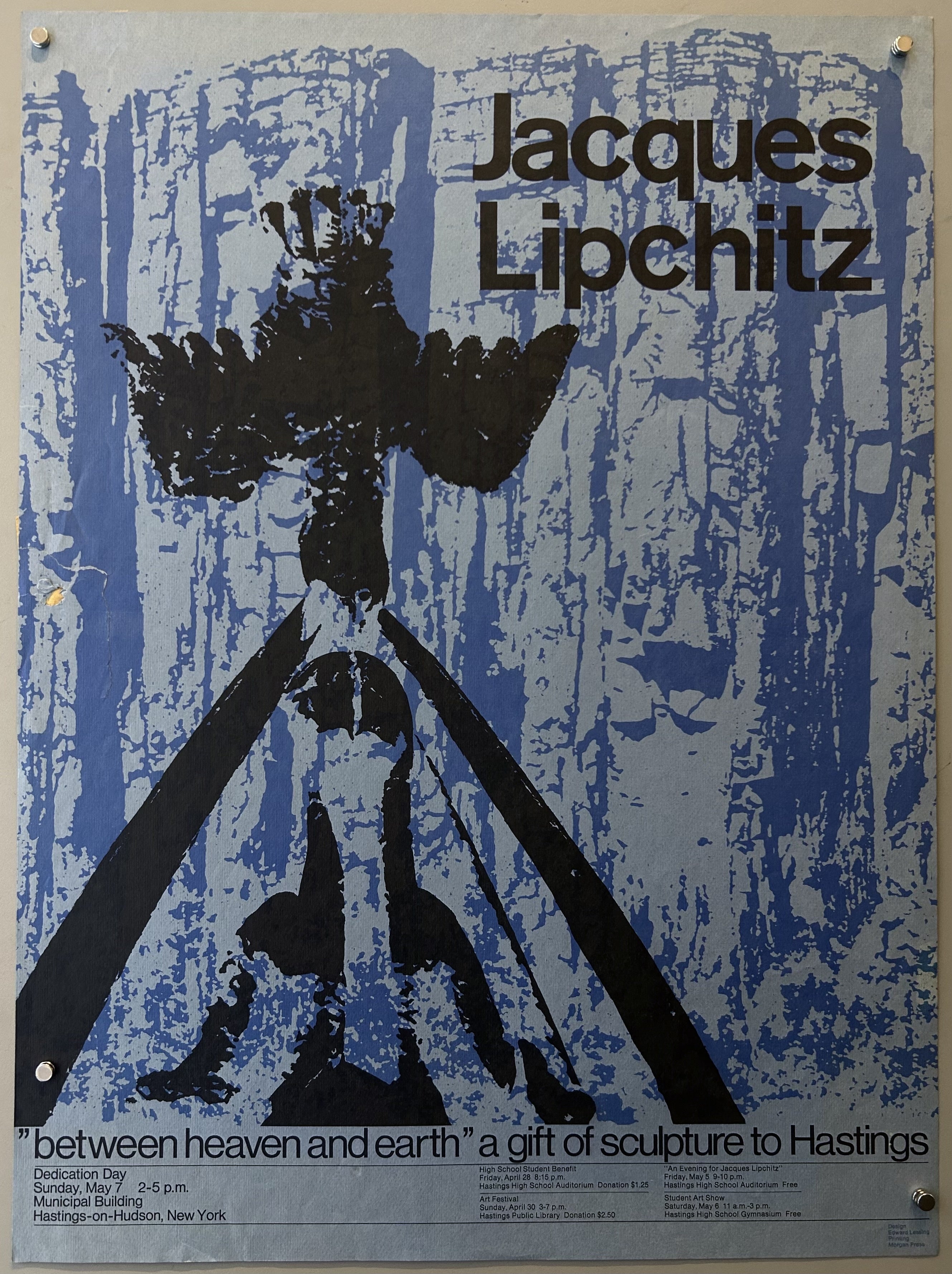 Promoting a dedication day for "between heaven and earth," a sculpture given to Hastings-on-Hudson, New York. Lipchitz was a Cubist sculptor, who resided in Hastings after his time at the School of Paris.