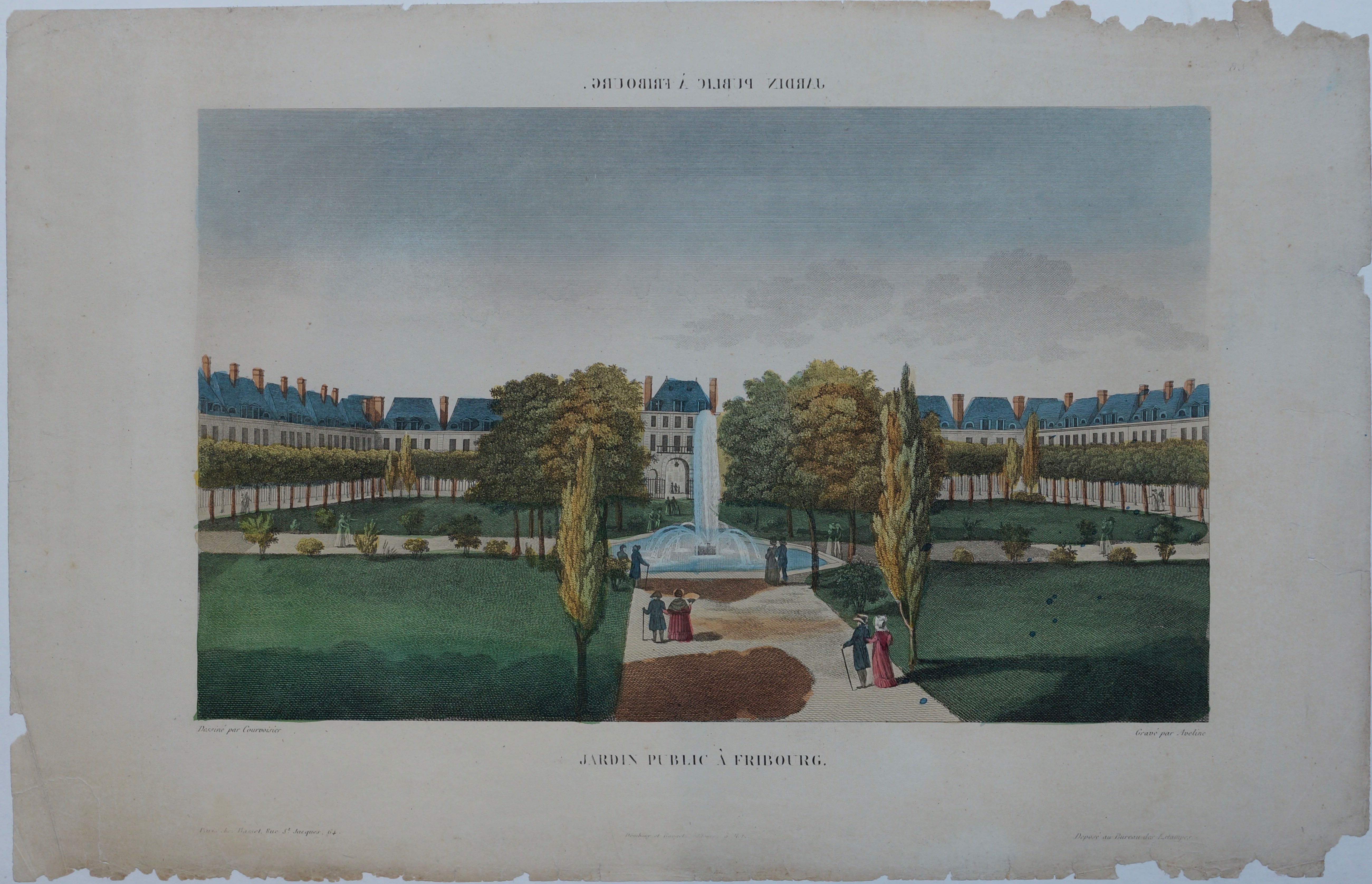 ""vue d' optige 100-250 architecture art beautiful building cane city couple depth perception fountain france french Fribourg grass green holding arms love men nature original posters people pine trees shadows size-14x22 Switzerland trees vintage vintage posters walking water woman
