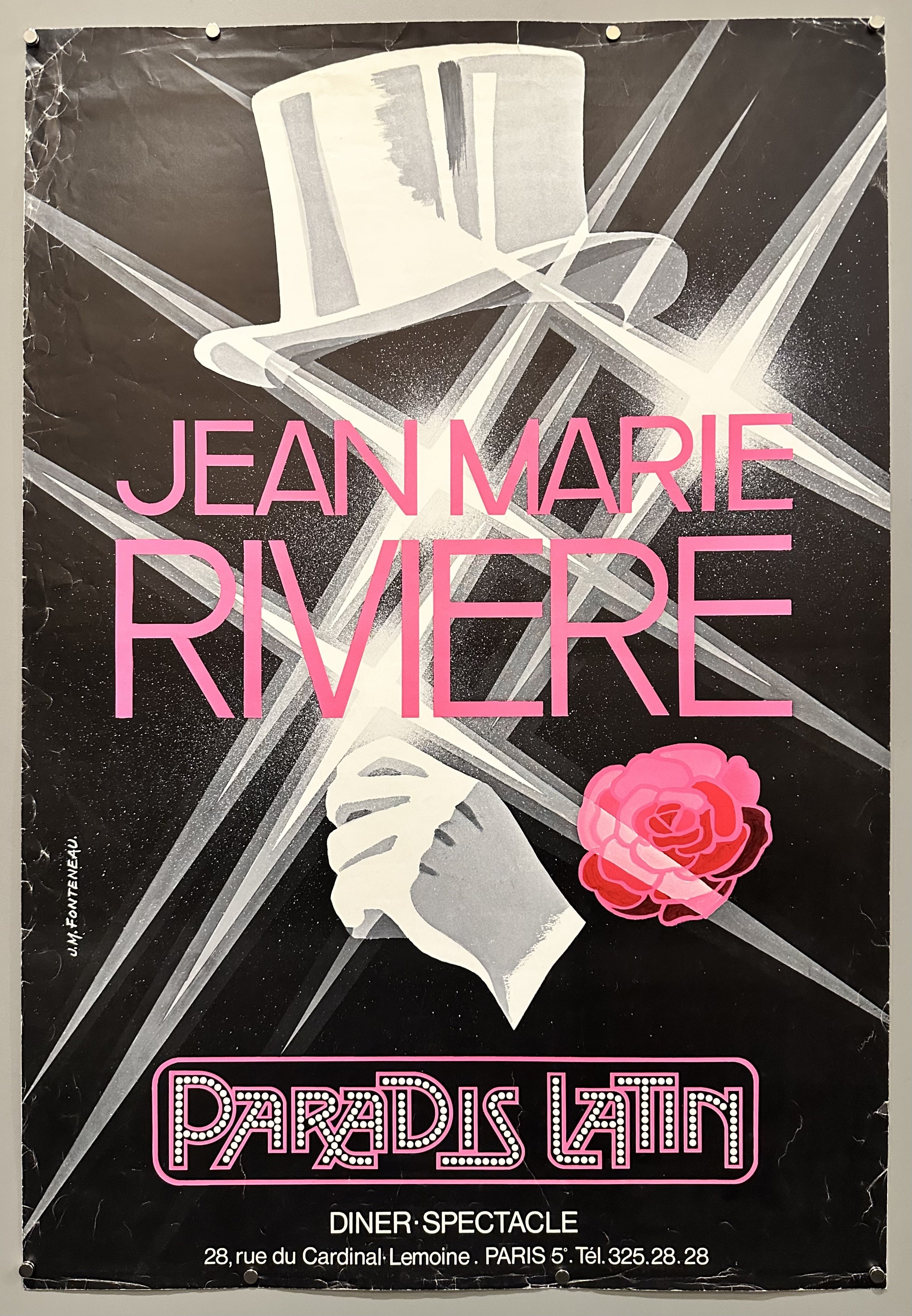 Original vintage poster for a "diner-spectacle" at the Paradis Latin cabaret in Paris, featuring Jean-Marie Rivière.