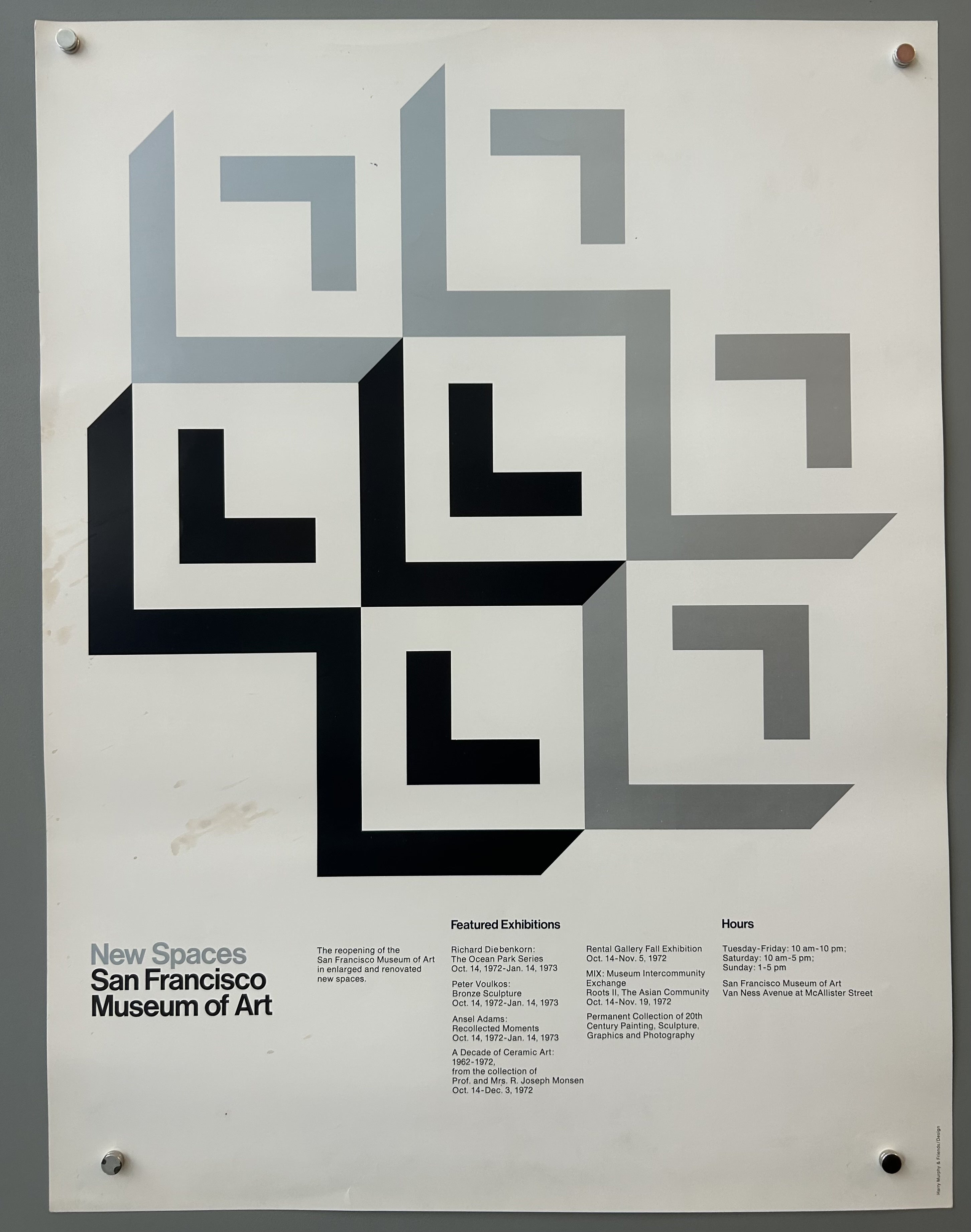 Exhibition poster for the San Francisco Museum of Art (SFMA), currently known as the San Francisco Museum of Modern Art (SFMOMA). It announces the museum's reopening in expanded and renovated spaces, listing several featured exhibitions from late 1972 to early 1973.