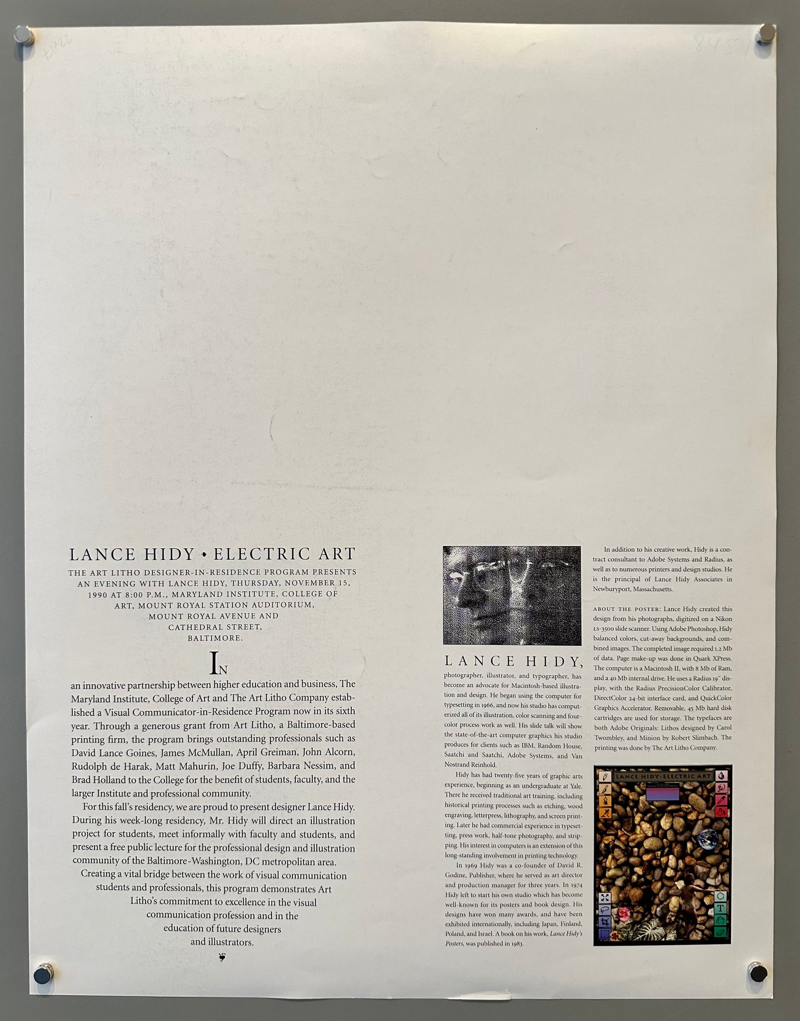 Double-sided promotional poster for an educational evening with designer Lance Hidy, who was to direct an illustration project for students at the Maryland Institute, College of Art.