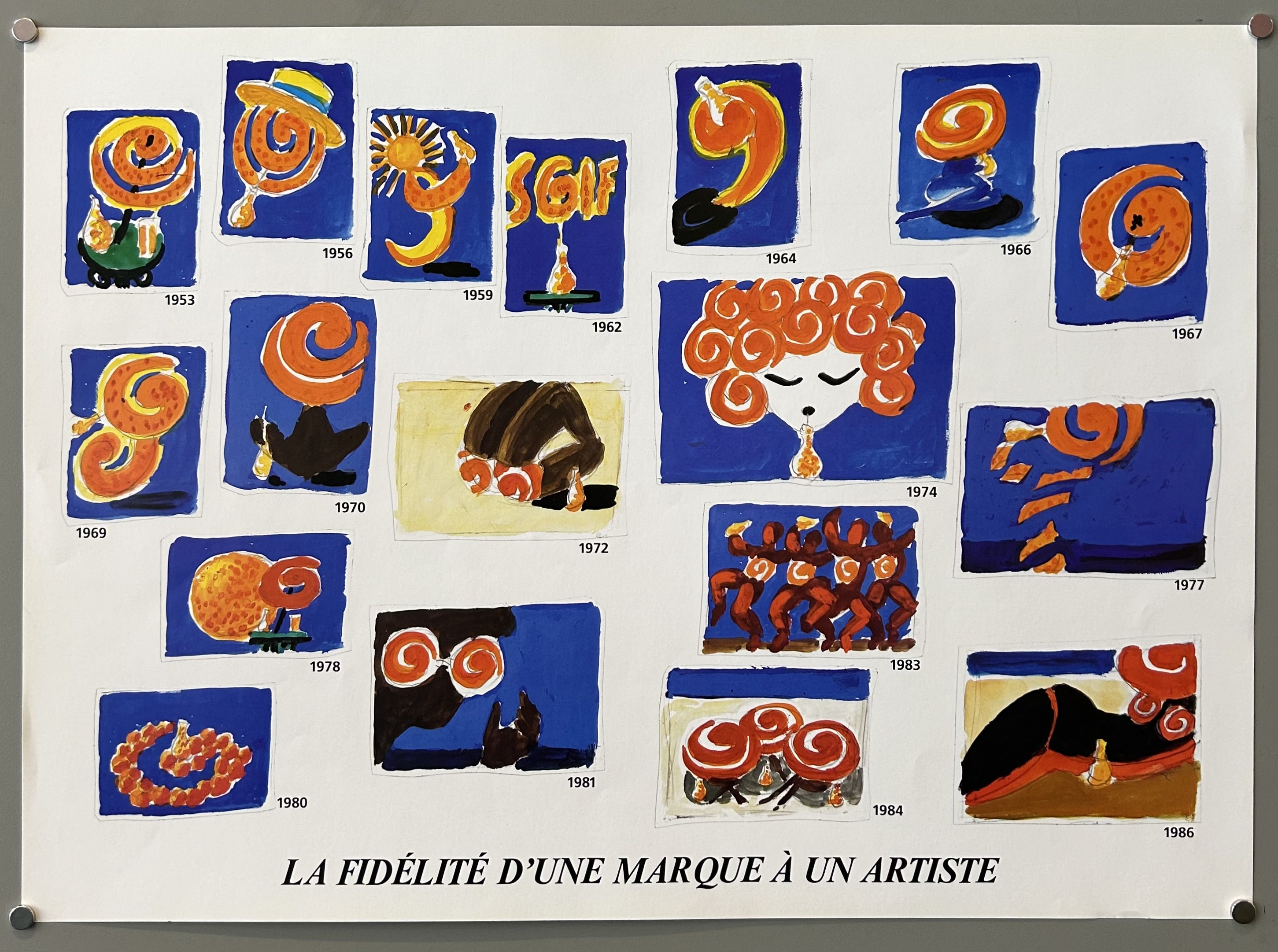 This sweet print shows different variations of Villemot logos for Orangina orange soda, starting from his first creation in 1953, all the way up to 1986.