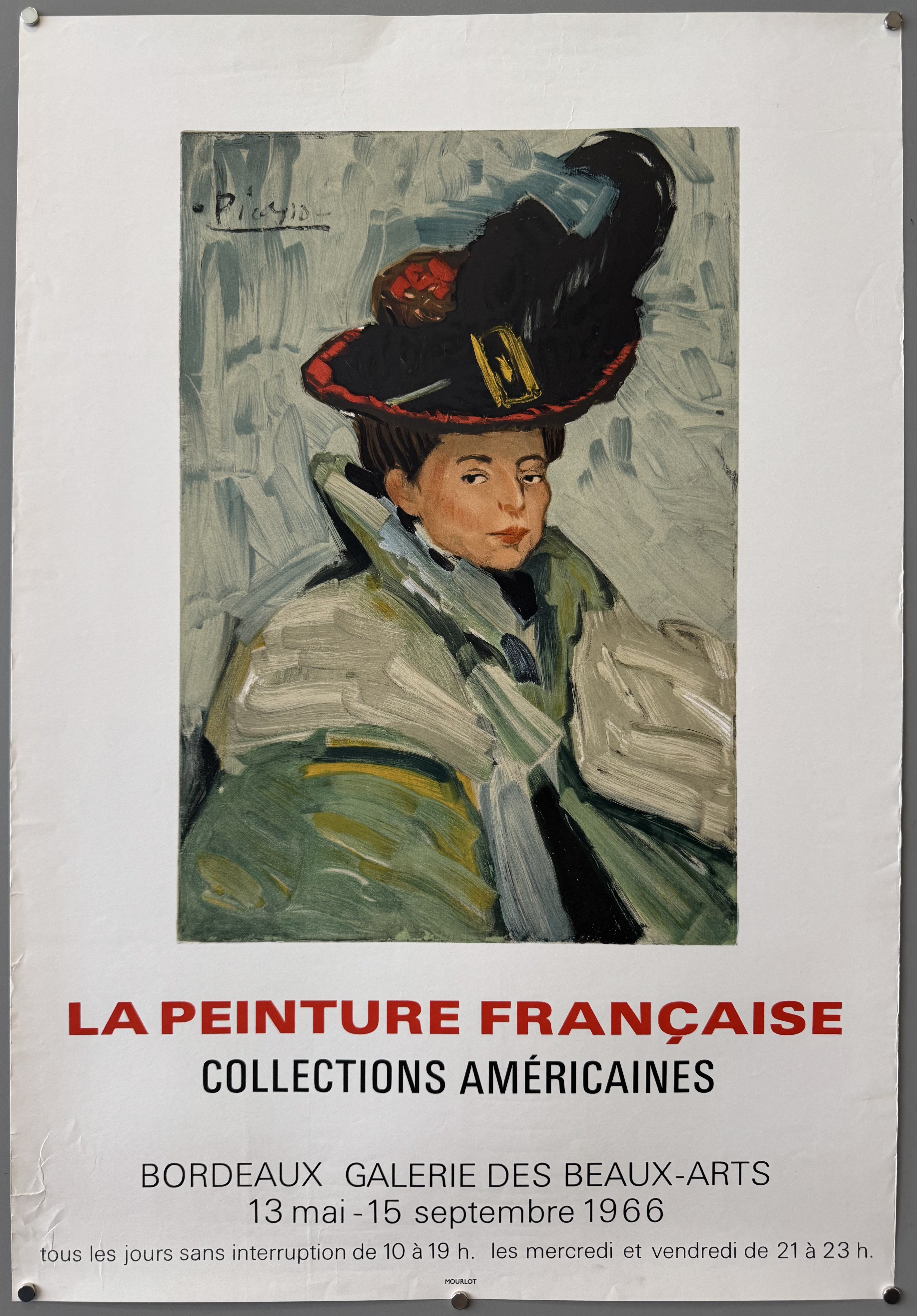 Original lithographic poster for a French art exhibition in Bordeaux at the Galerie des Beaux-Arts. Featured is Pablo Picasso's painting "Woman with a Hat."