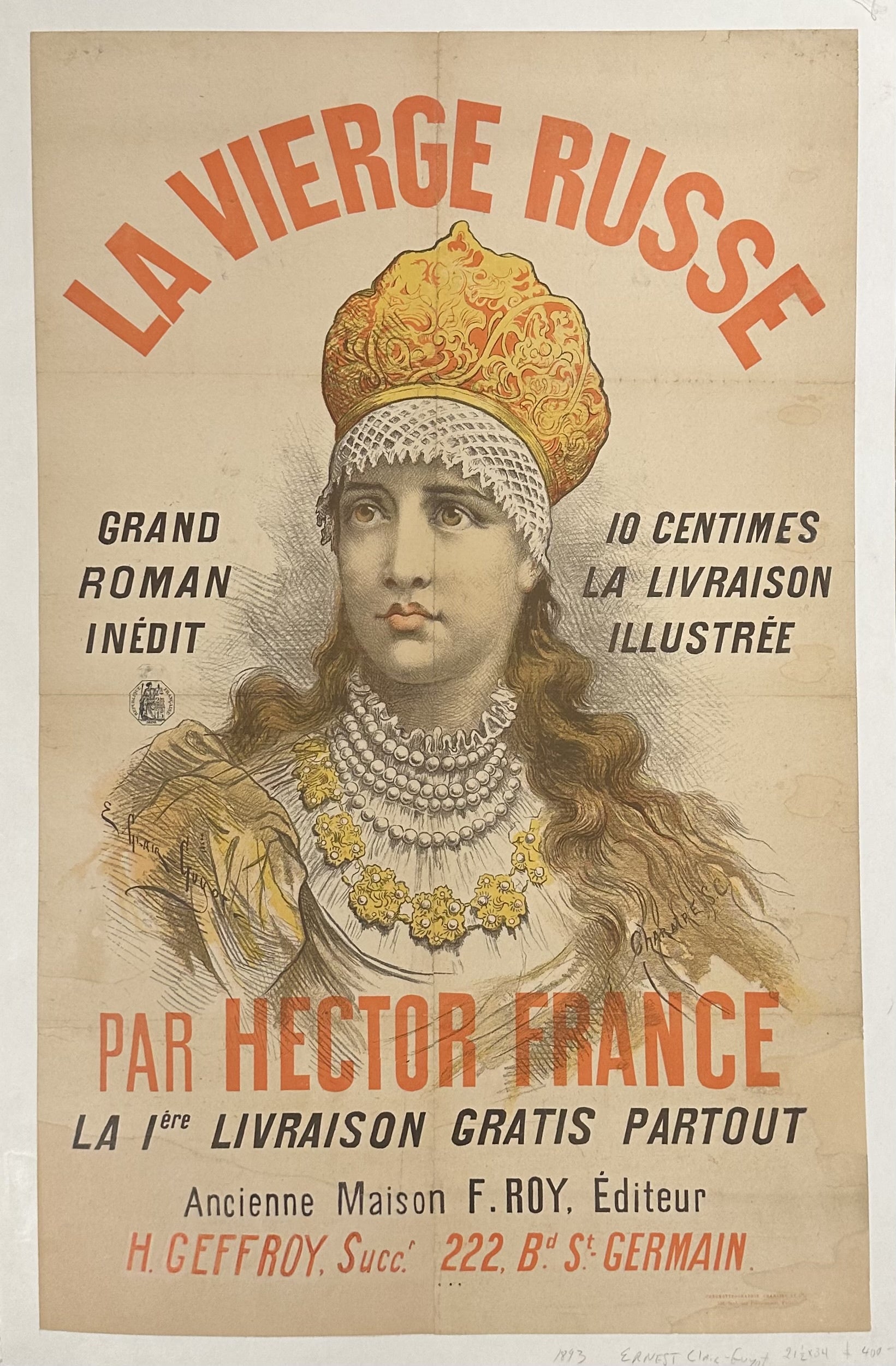 Original turn-of-the-century poster promoting "The Russian Virgin", a work of fiction written by Hector France in the late 19th century, around 1893.