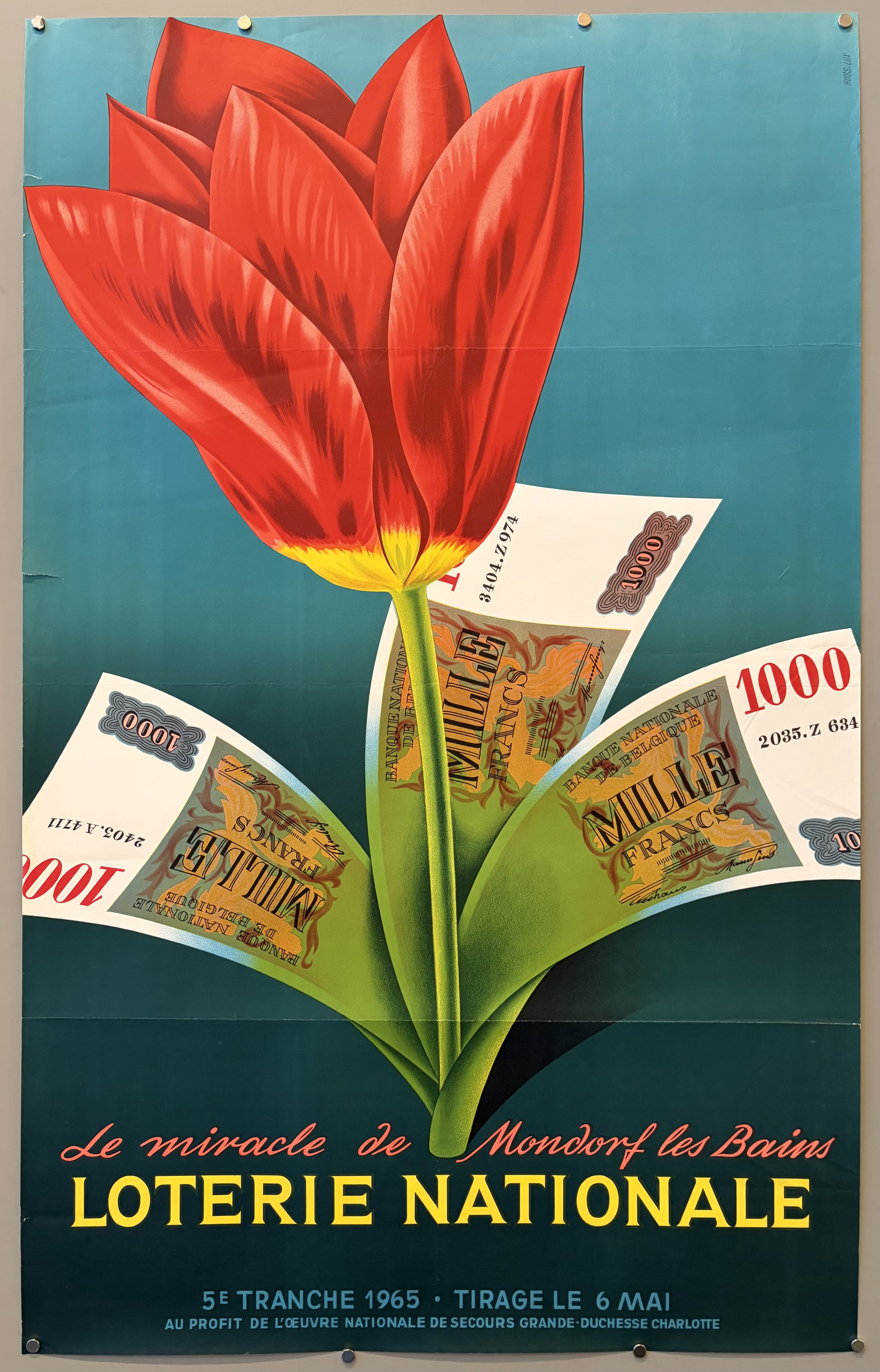 An original Loterie Nationale poster. The Luxembourgish National Lottery was known for producing whimsical and color-packed pieces, often by prominent poster artists, to be displayed on the street.