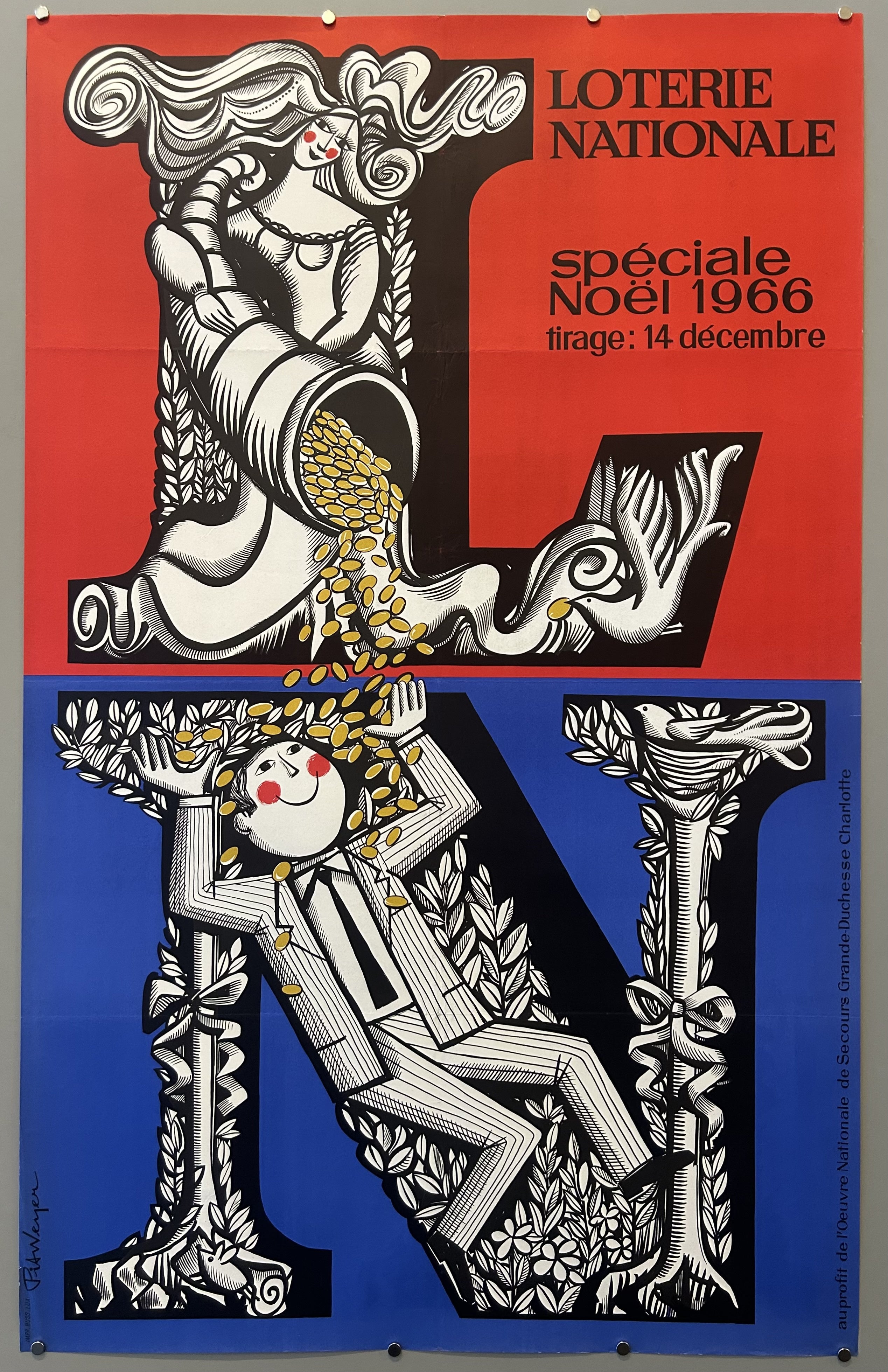 Promotional poster for the Luxembourgish National Lottery, benefiting the National Relief Work of Grand Duchess Charlotte.