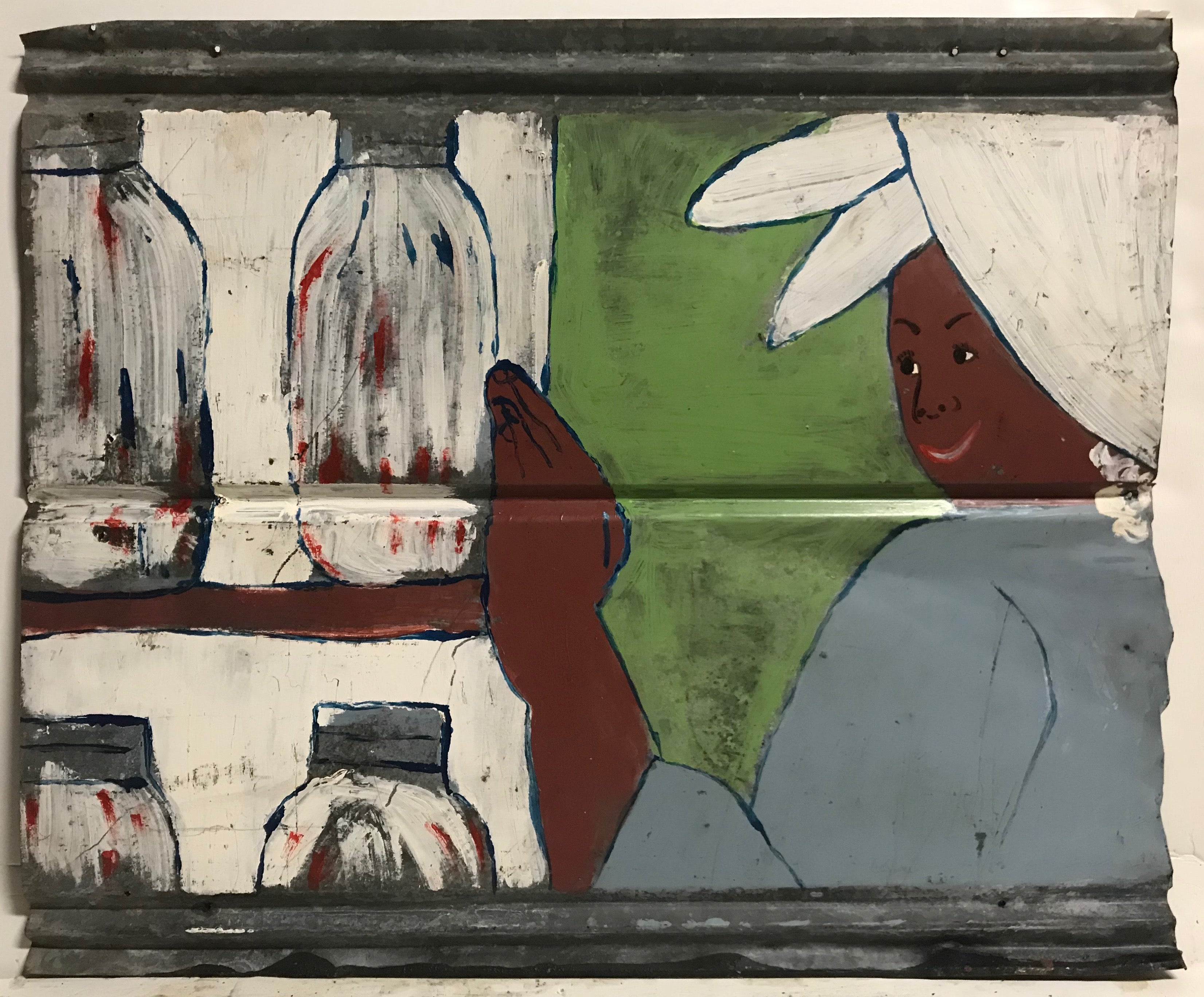 A native Georgian, Leonard Jones taught himself to paint when he was in high school. His works are greatly inspired by scenes from his childhood, images of rural living in the South including housewives, church-goers, and laborers. A folk artist who is often considered outsider, Jones paints to capture candid daily life and the beauty found in the community around him.The use of scrap wood or tin roofing alludes to the buildings he grew up with, and he often incorporates these materials into the paintings themselves. The materials are covered in bold backgrounds of color, which Jones paints subjects over using his fingers or the handles of brushes, leaving a distinctly Leonard Jones work of art.