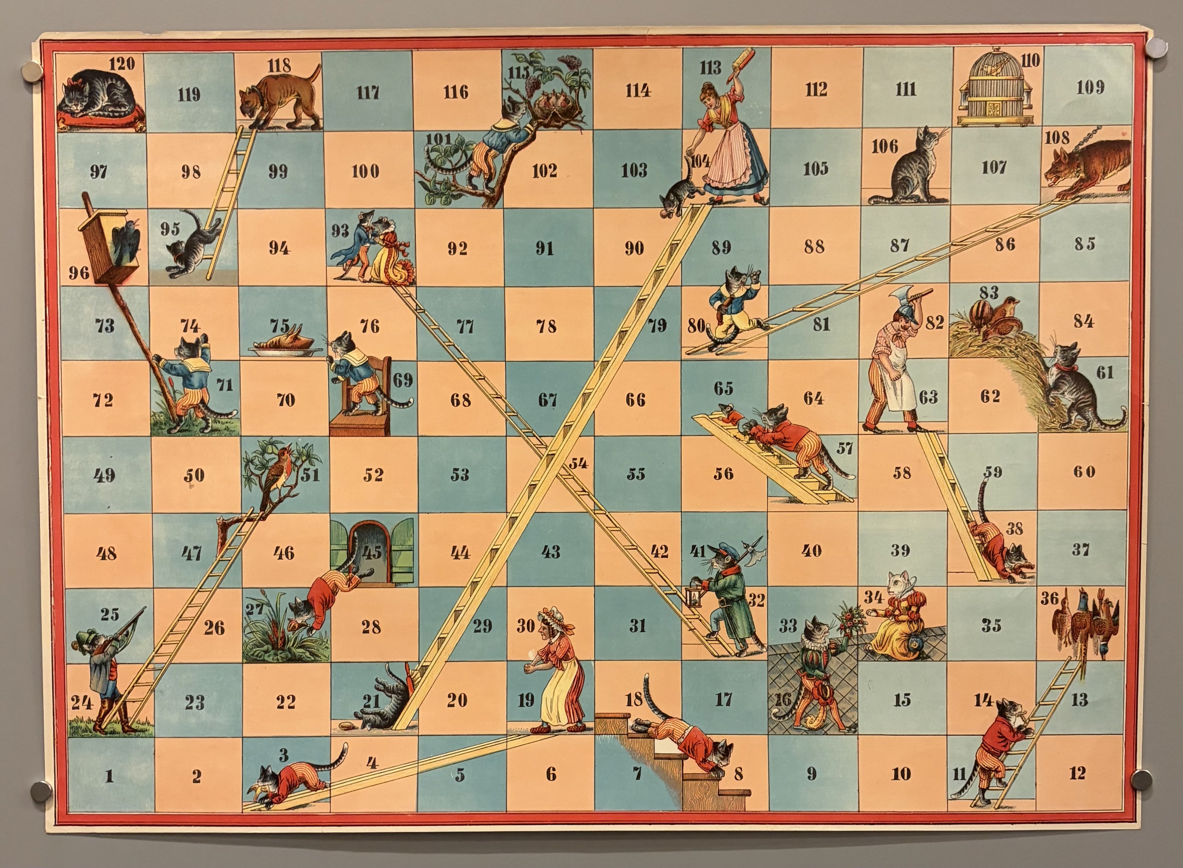 Paper illustration of a vintage French board game print from around the 1910s called "Miau! Miau!" (also known as "Miaou-Miaou"). It is a variant of the traditional "Snakes and Ladders" game, featuring cats and mice in the illustrations.