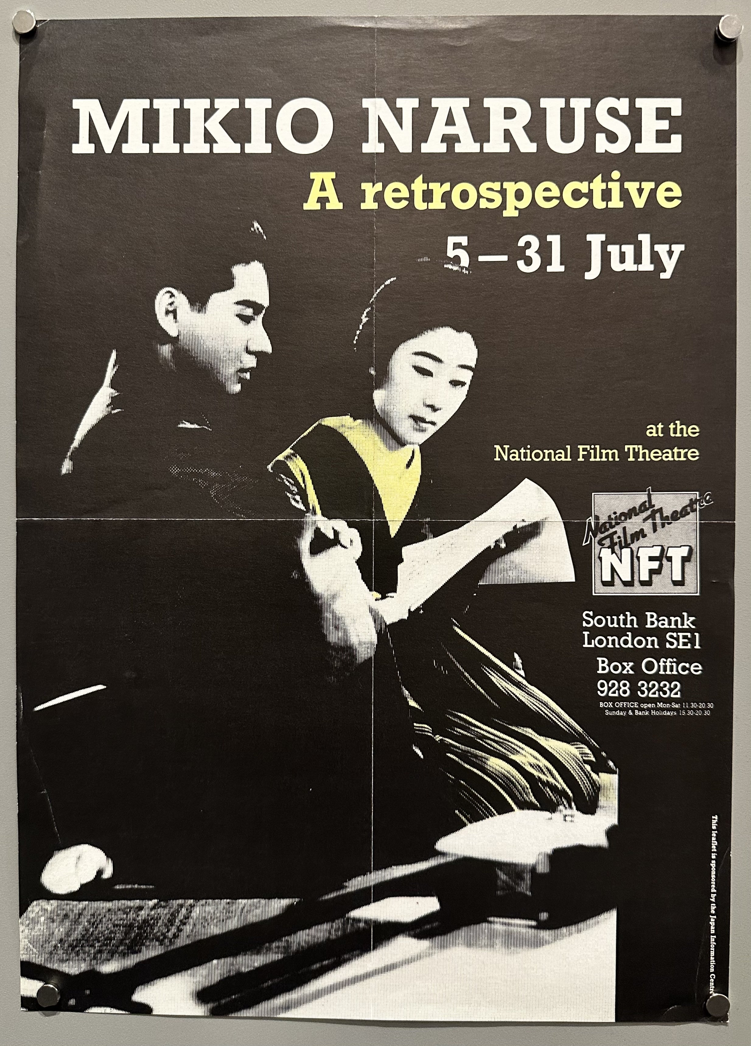 Promotional poster for a Mikio Naruse film retrospective held at the National Film Theatre (NFT) in London from July 5–31, 2007. A season of his greatest films was shown at the BFI Southbank during this period, sponsored by the Japan Foundation, to introduce his work to a UK audience.