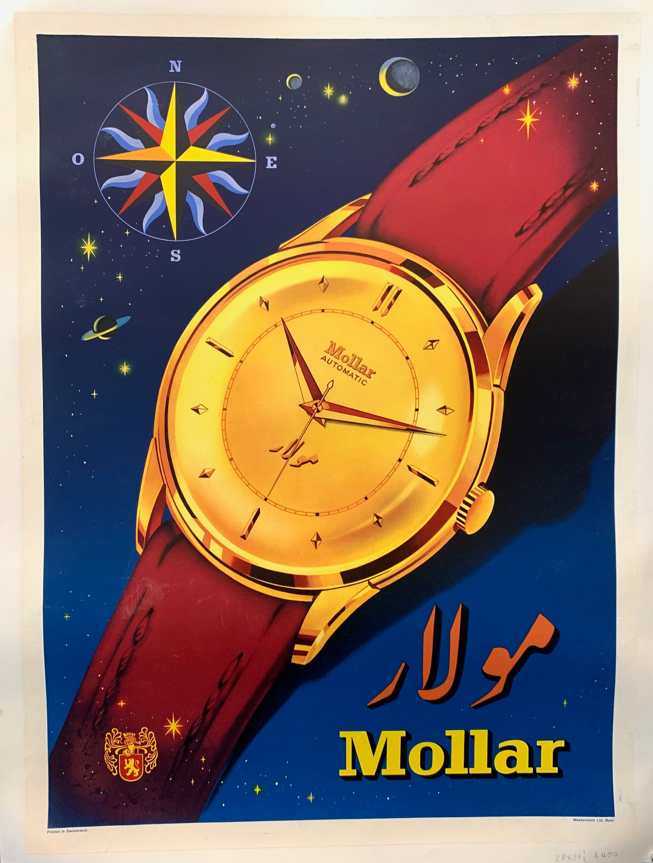 Swiss Advertisement Poster for a Mollar Automatic Watch. Features a nice outer space design and the company's crest in the bottom left corner.