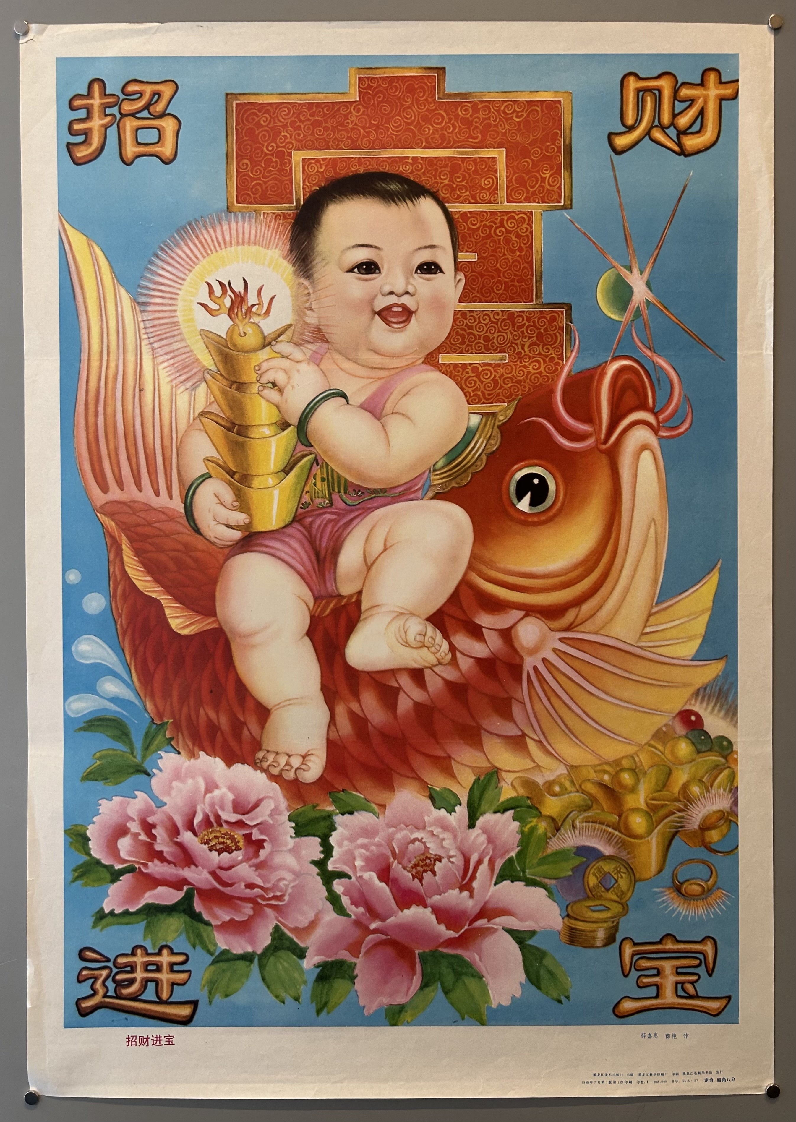 A New Year picture (nianhua) is a form of colored print (banhua), used for decoration and the performance of rituals during the Chinese New Year Holiday. Here, a chubby baby sits on a golden koi fish, blossoming flowers and amble gold coins at the base.