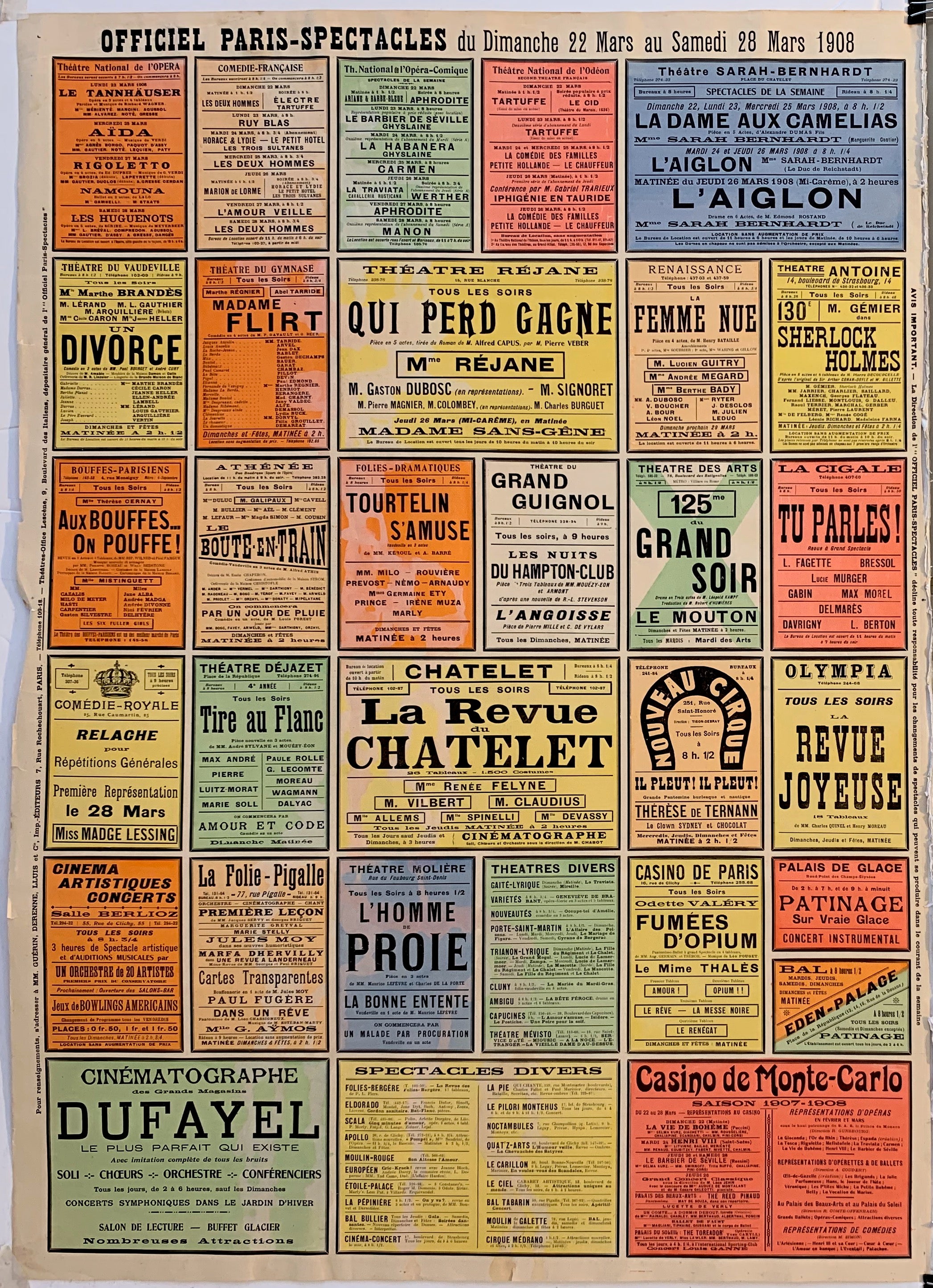 Beautiful 1908 poster from Paris advertisting theatre performances. Theatres include Jardin de Paris, Opéra-Comique, Théatre Sarah-Bernhardt, Le Concert Populaire, Etoile-Palace, Théatre Réjane, Vaudeville, Bouffes-Parisiens, Athénée, Folie-Pigalle, Princess Théatre, and more.
