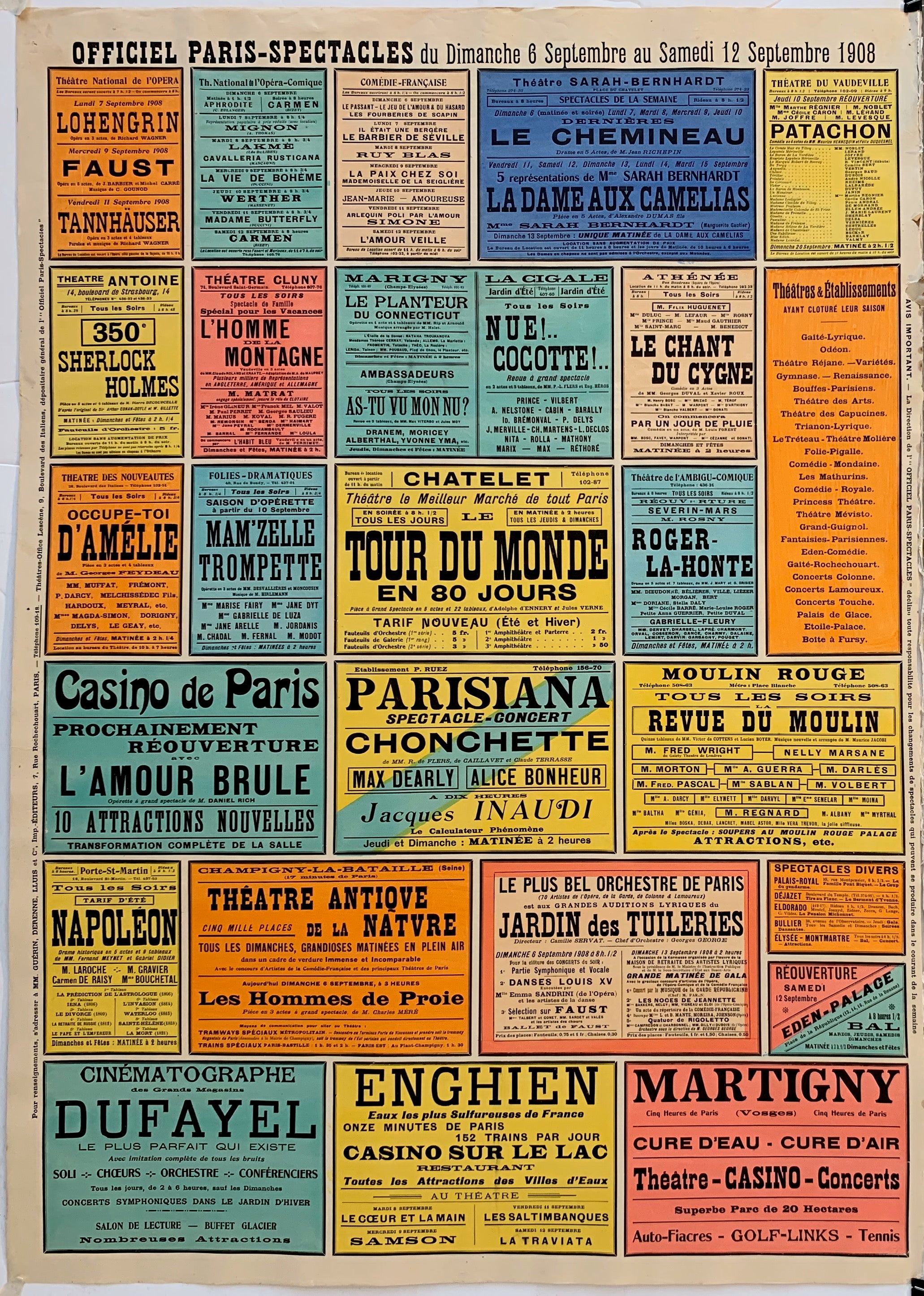 Beautiful 1908 poster from Paris advertisting theatre performances. Theatres include Jardin de Paris, Opéra-Comique, Théatre Sarah-Bernhardt, Le Concert Populaire, Etoile-Palace, Théatre Réjane, Vaudeville, Bouffes-Parisiens, Athénée, Folie-Pigalle, Princess Théatre, and more.
