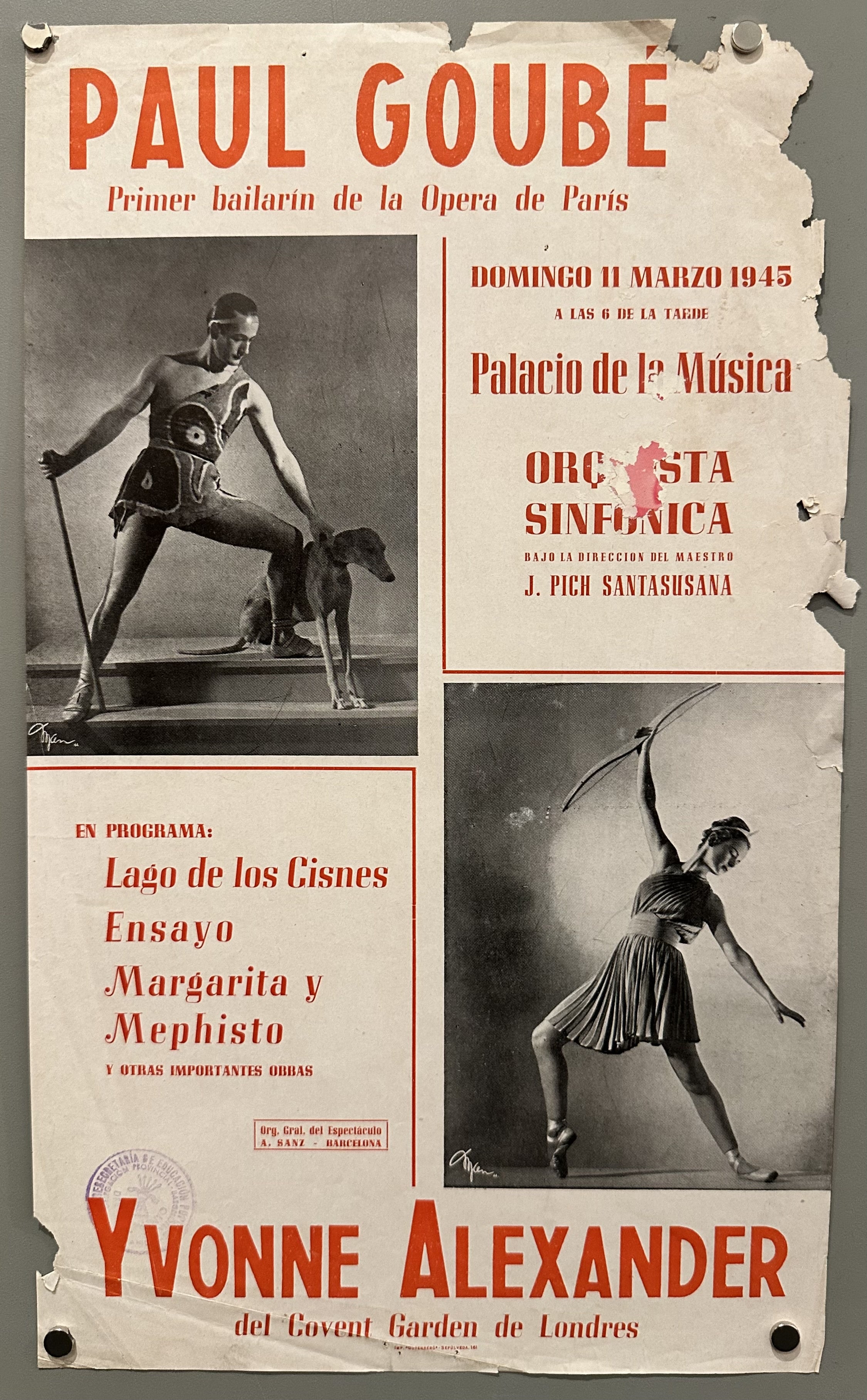 Original poster promoting a ballet performance featuring Paul Goubé and Yvonne Alexander at the Palacio de la Música on March 11, 1945. The performance was conducted by Maestro J. Pich Santasusana. The program included works such as Lago de los Cisnes (Swan Lake), Ensayo (Rehearsal), Margarita y Mephisto (Margarita and Mephisto), and other important works.