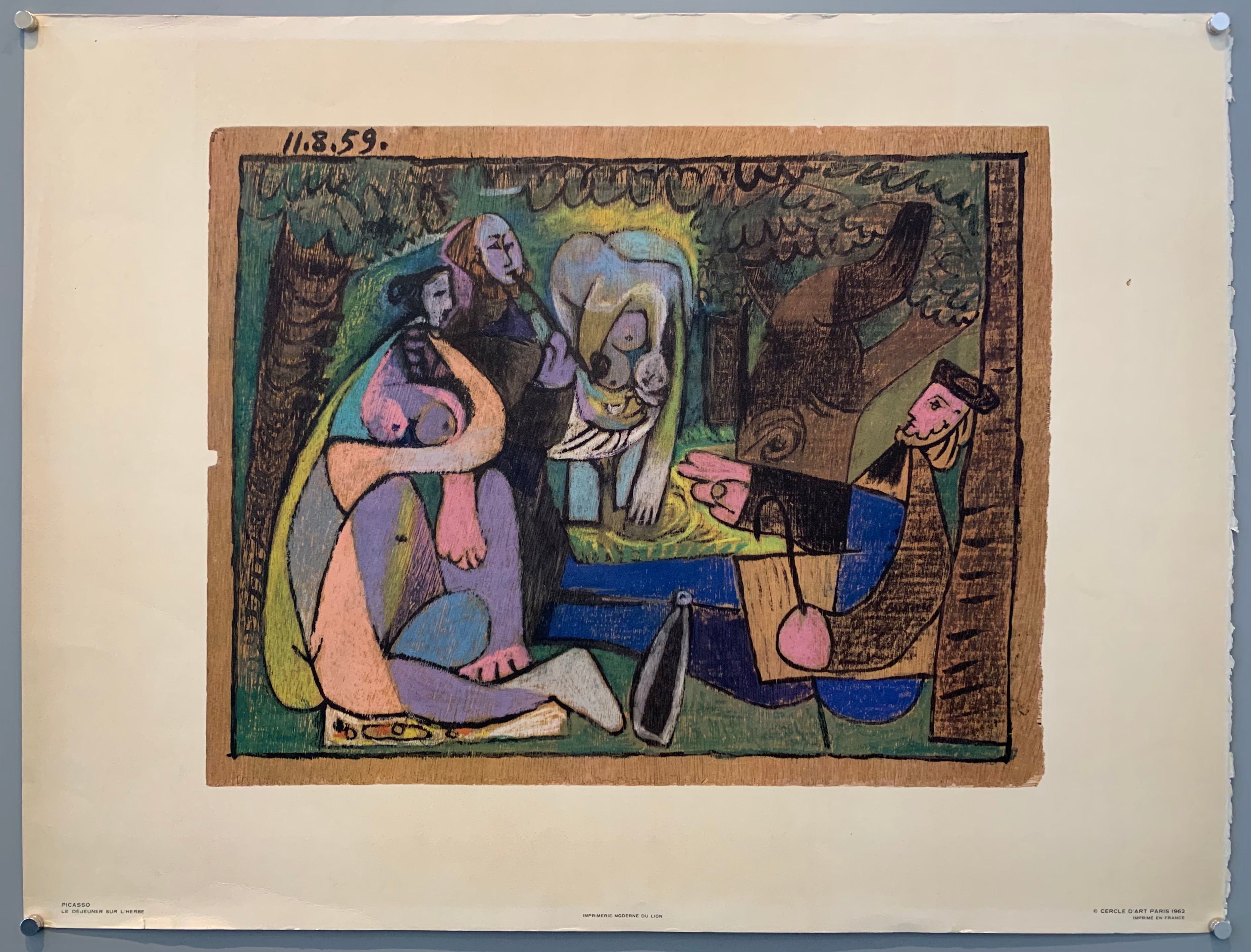 Description: Picasso completed around 40 different works inspired by the original Le déjeuner sur l’herbe by Manet. This was a period of growth for Picasso, where he focused on redoing past paintings with his new, revolutionary styles. The specific one shown here from 1959 was one of Picasso’s earlier replicas of the original. His Cubist, avant-garde style that so often left the art community at the time scandalized is celebrated in all its vivid color and imagery here.
