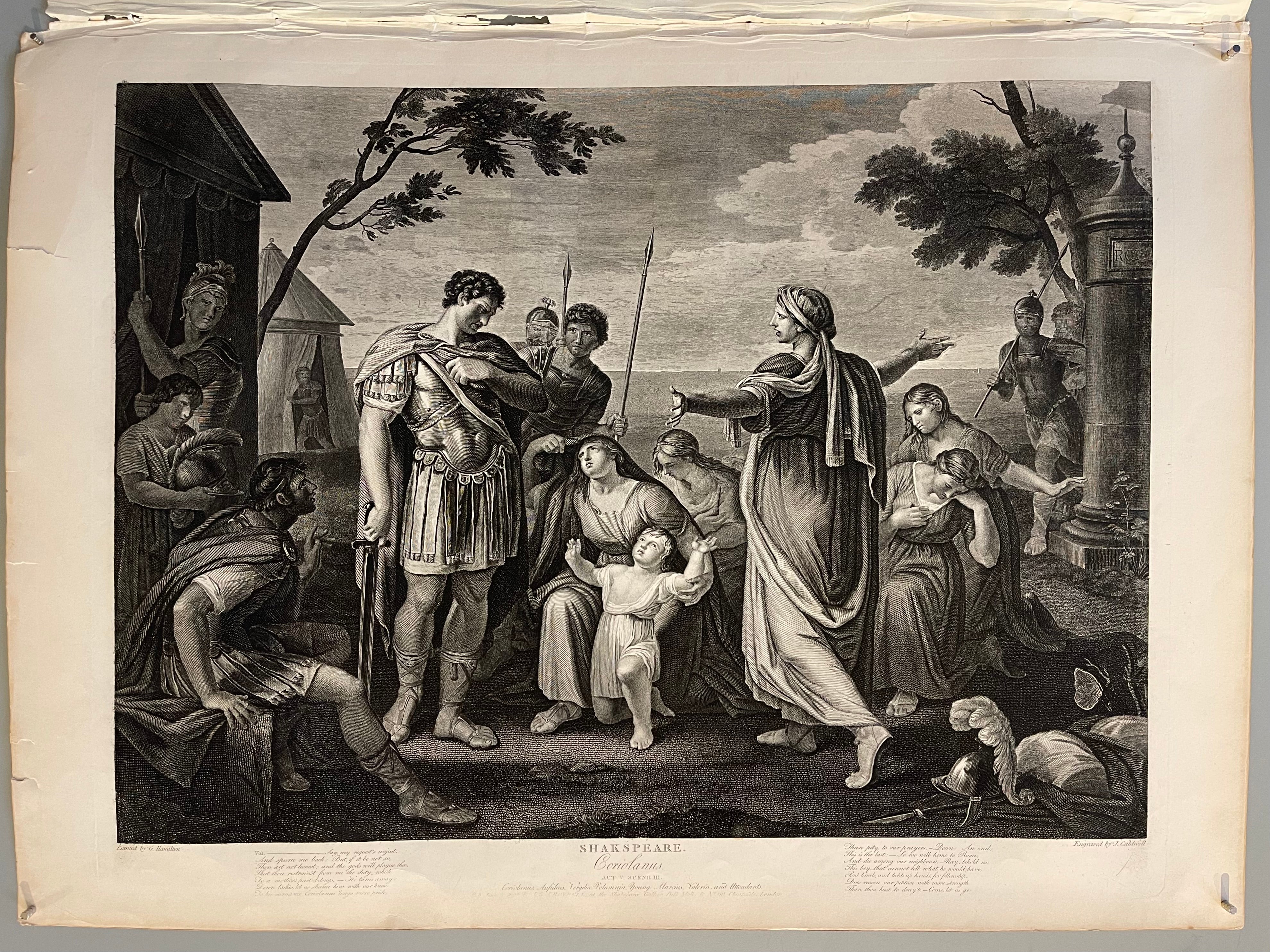 Engraving of Act V Scene III of Shakespeare's Coriolanus with transcription underneath the image.