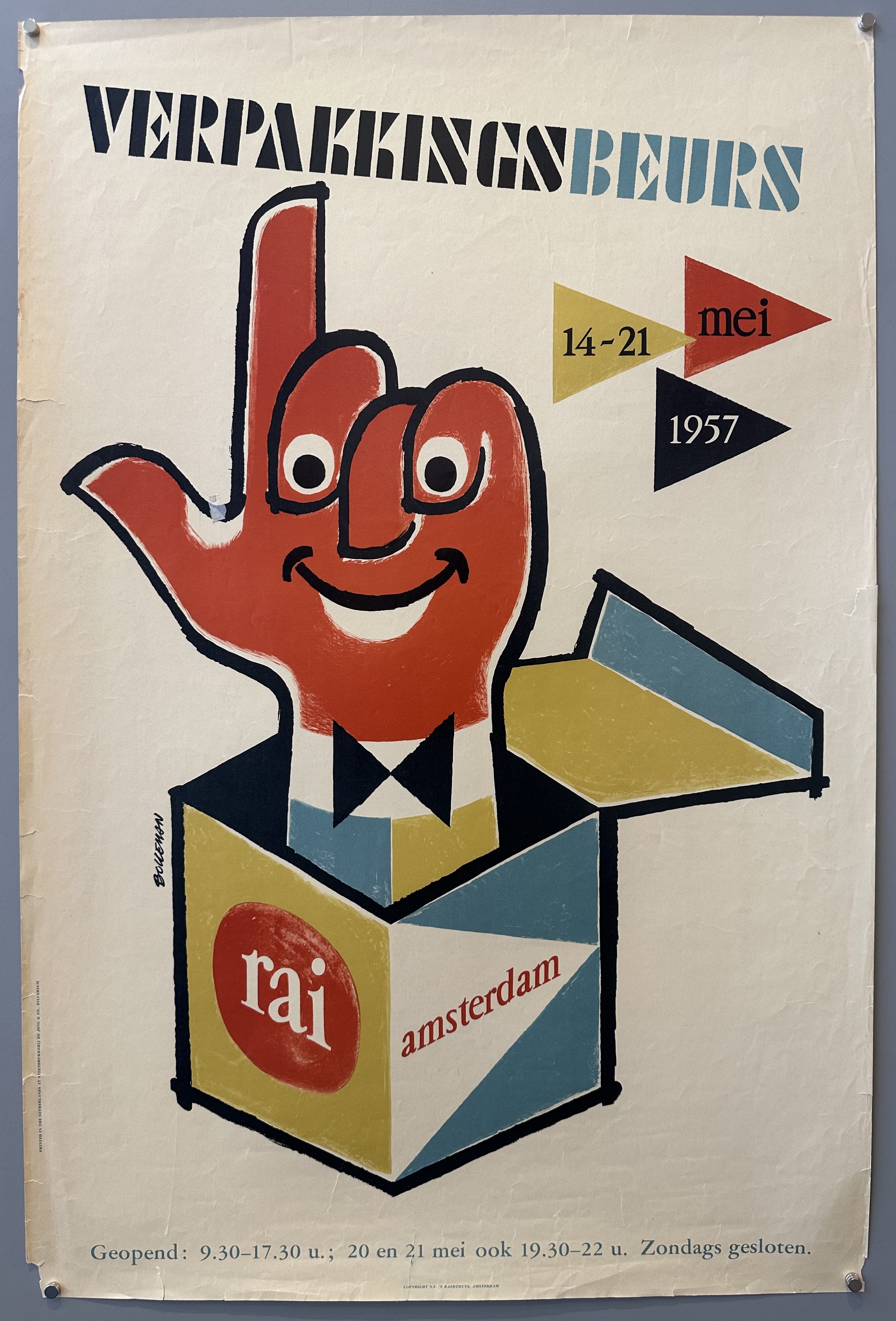 "Verpakkingsbeurs / 14-21 mei 1957 / RAI Amsterdam / Geopend: 9.30-17.30 u.; 20 en 21 mei ook 19.30-22 u. Zondags gesloten"