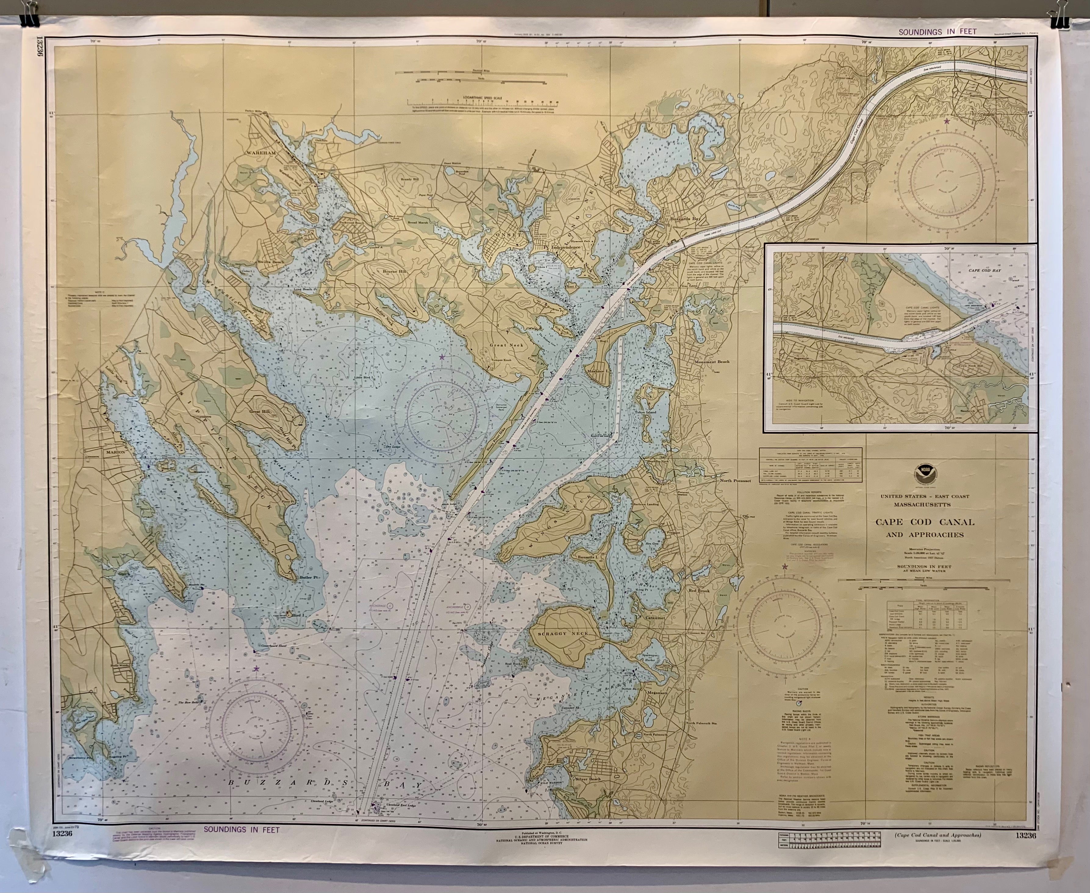 The National Oceanic and Atmospheric Administration (NOAA) created and distributed this map of Cape Cod Canal and Approaches and its various points of entry for informational purposes amongst both commercial and recreational mariners by providing soundings in feet, locations of radar reflectors, and a logarithmic speed scale.