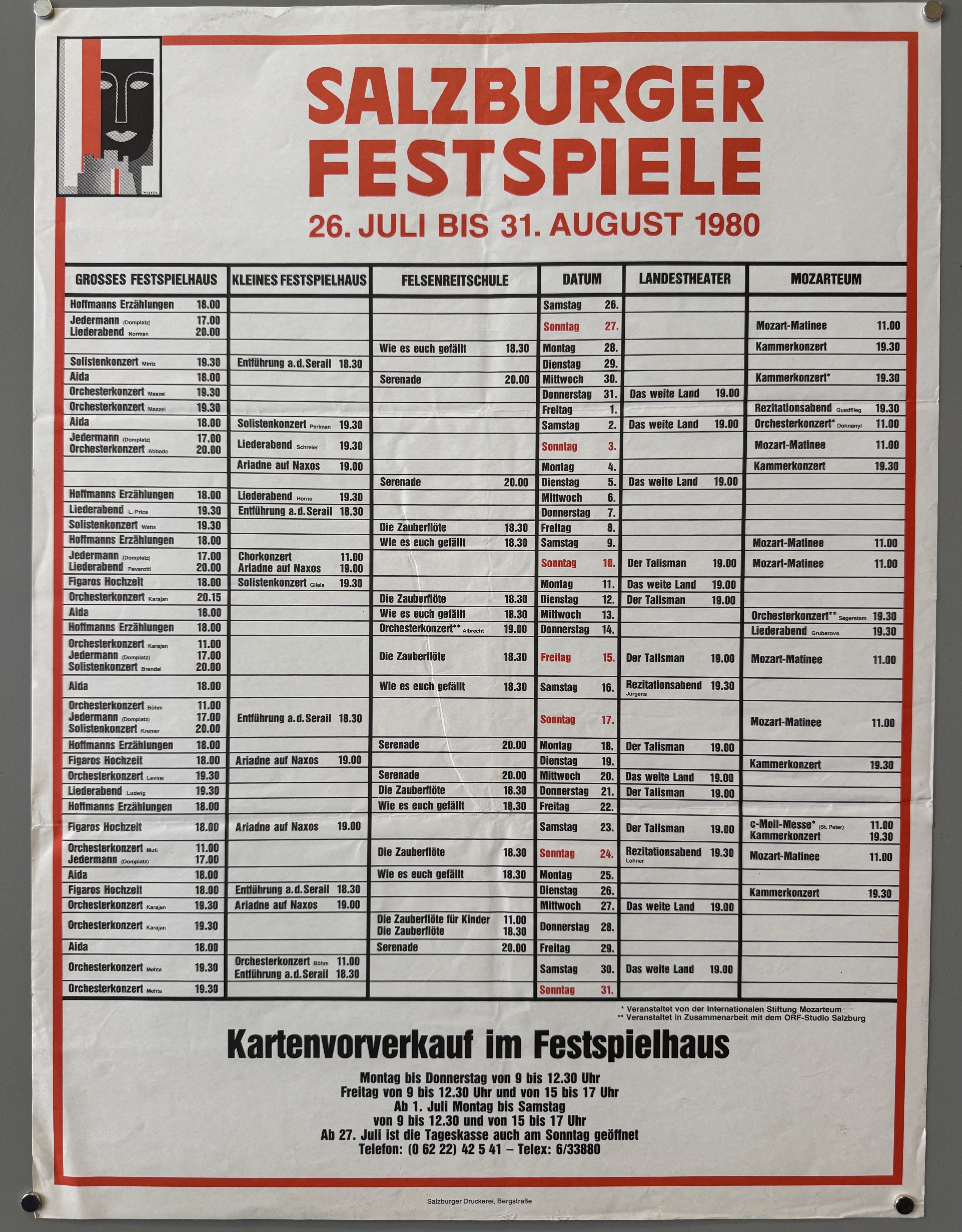 Poster highlighting a program for the Salzburg Festival, a renowned festival of music and drama held annually in Salzburg, Austria. This specific program is for the 1980 summer festival, listing performances and venues.