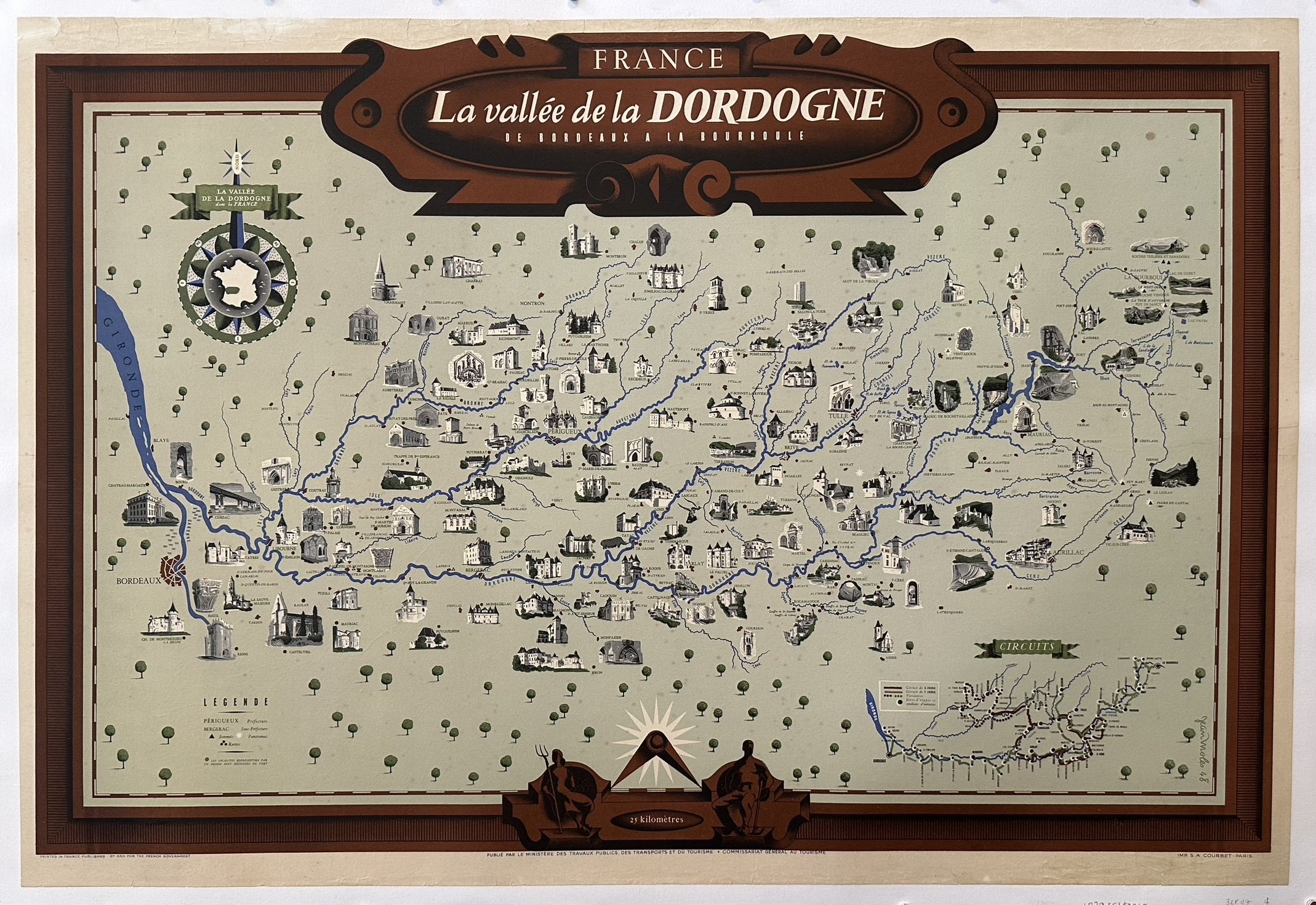 Depicts the Dordogne Valley in France, specifically mapping the area from Bordeaux to La Bourboule.