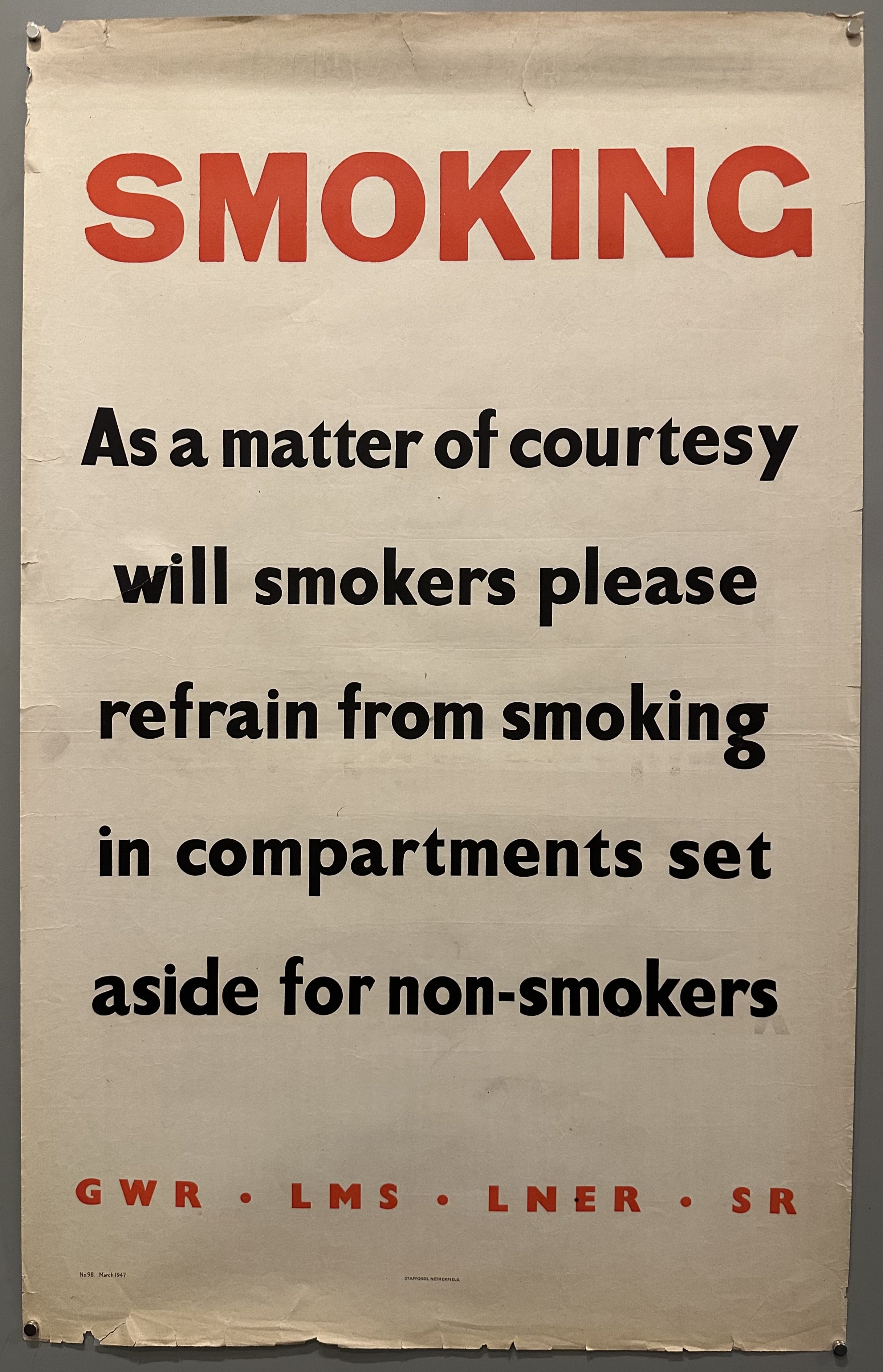 Original poster for a British railway requesting smokers to be courteous. The sign was issued jointly by four major British railway companies: Great Western Railway (GWR), London, Midland and Scottish Railway (LMS), London and North Eastern Railway (LNER), and Southern Railway (SR).