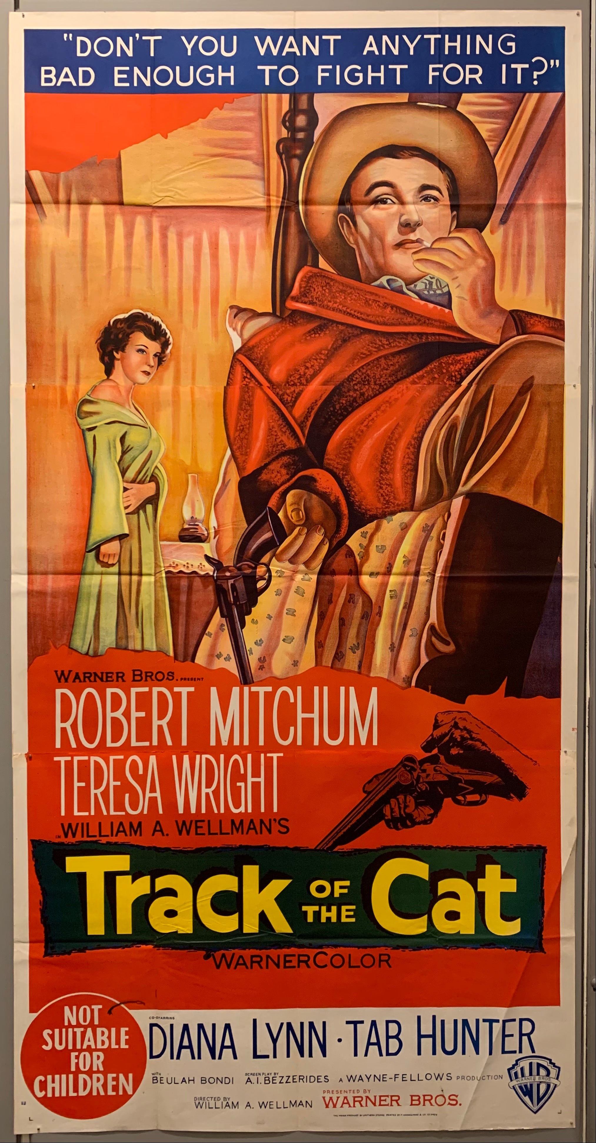 This dramatic poster advertises the 1954 Warner Brothers Western film titled Track of the Cat. Starring Robert Mitchum, Teresa Wright, Diana Lynn, and Tab Hunter and produced by famed actor John Wayne, the film follows the inhabitants of a secluded ranch through a harsh Northern Californian winter. The poster reads '"Don't you want anything bad enough to fight for it?"', hinting at the drama and tragedy that the ranchers will endure throughout the season.