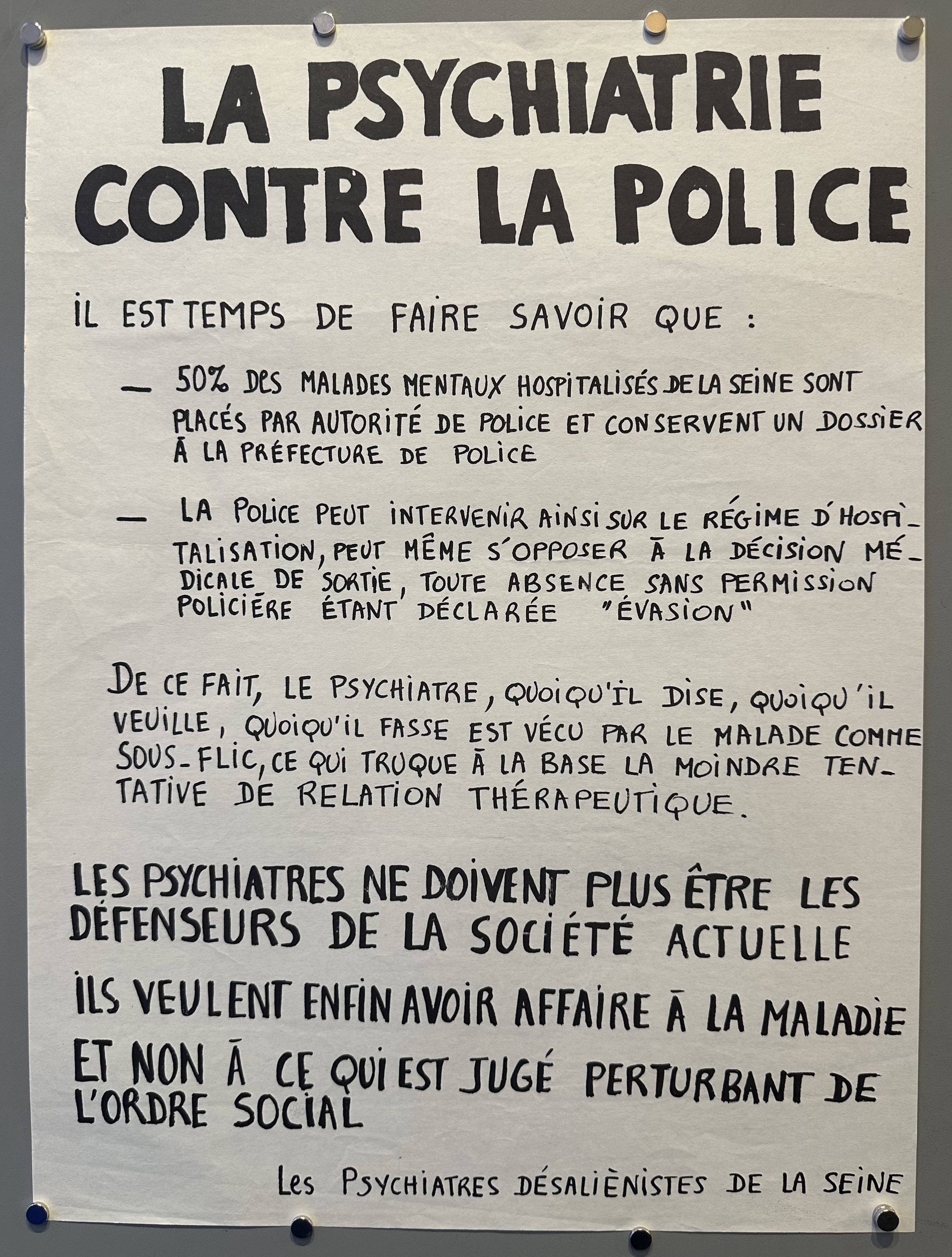 English translation: "Psychiatry against the police / Psychiatrists must no longer be the defenders of today's society / They finally want to avoid dealing with illness / And not with what is considered to disrupt social order"