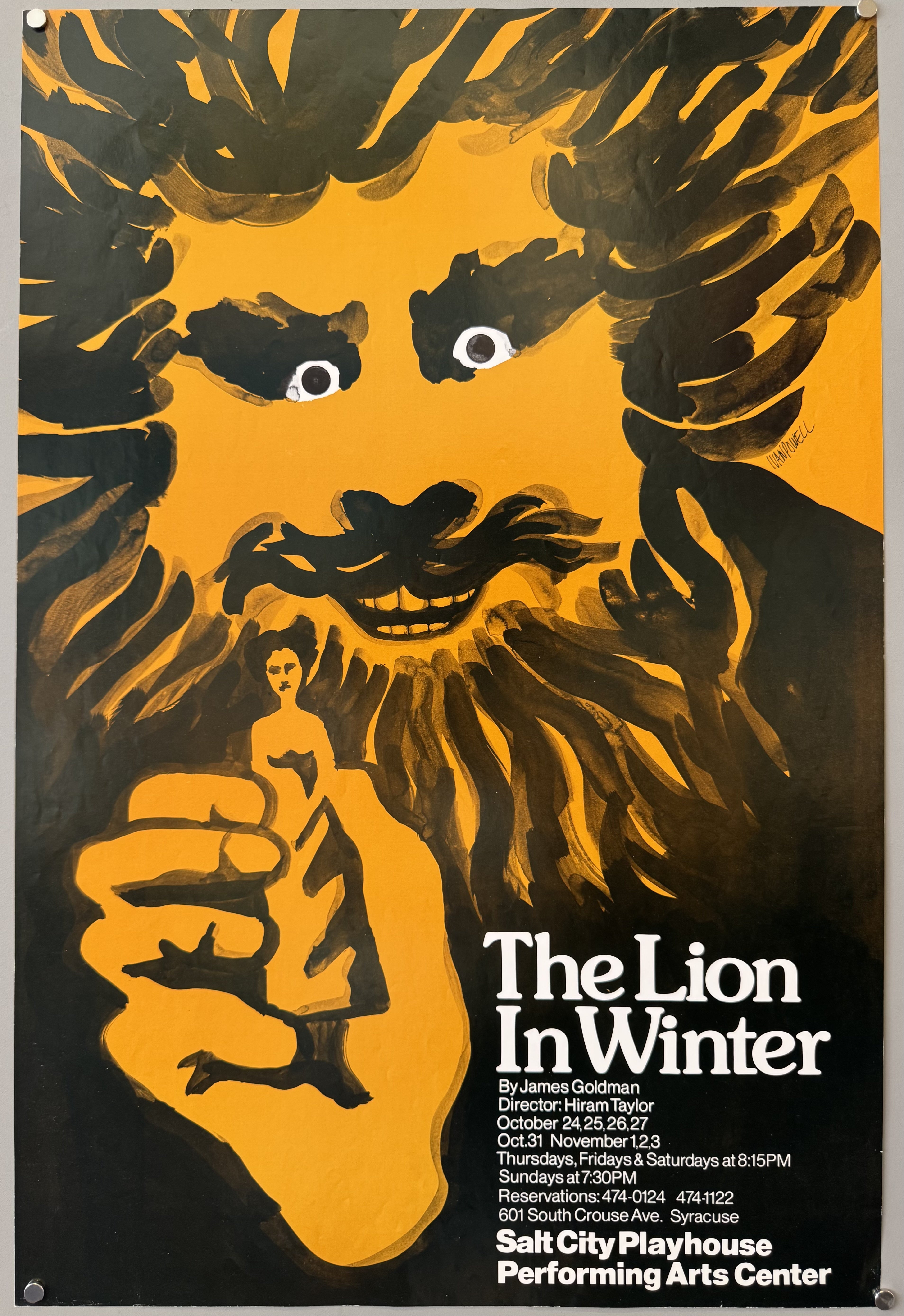 Vintage theater poster for a production of The Lion In Winter, the classic play by James Goldman. The play was performed at the Salt City Playhouse Performing Arts Center in Syracuse.