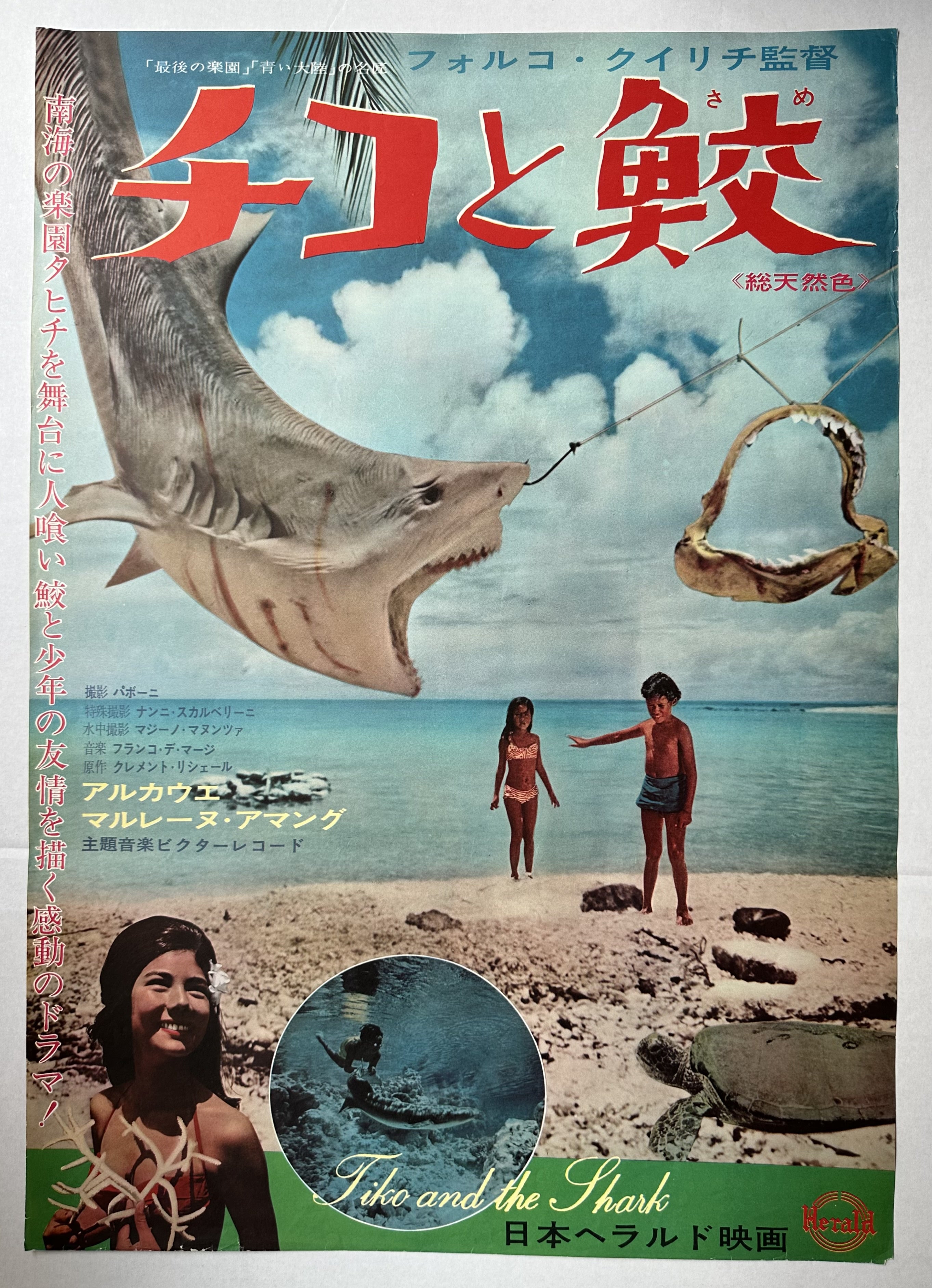 Poster for Tiko and the Shark, a Japan Herald Movie. "A moving drama depicting the friendship between a man-eating shark and a boy set in the paradise of Tahiti in the South Sea."