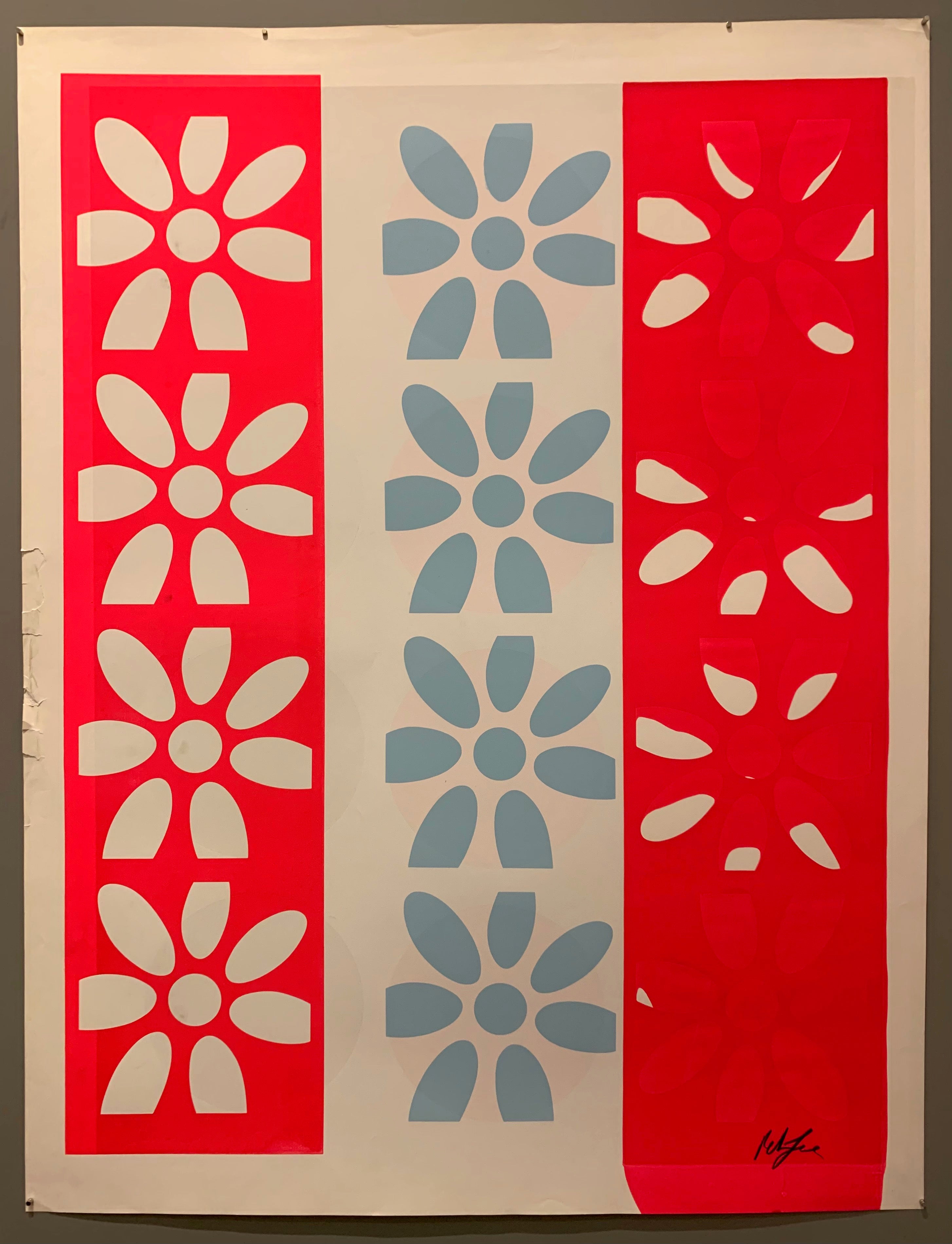 Original silkscreen print by artist Peter Gee showing three panels of flowers: on the right a pink panel with flowers, in the middle a white panel with blue flowers, and on the left another pink panel, except these white flowers are partially filled in with another layer of pink. This break in the symmetry of the piece makes for a more playful and engaging visual field.