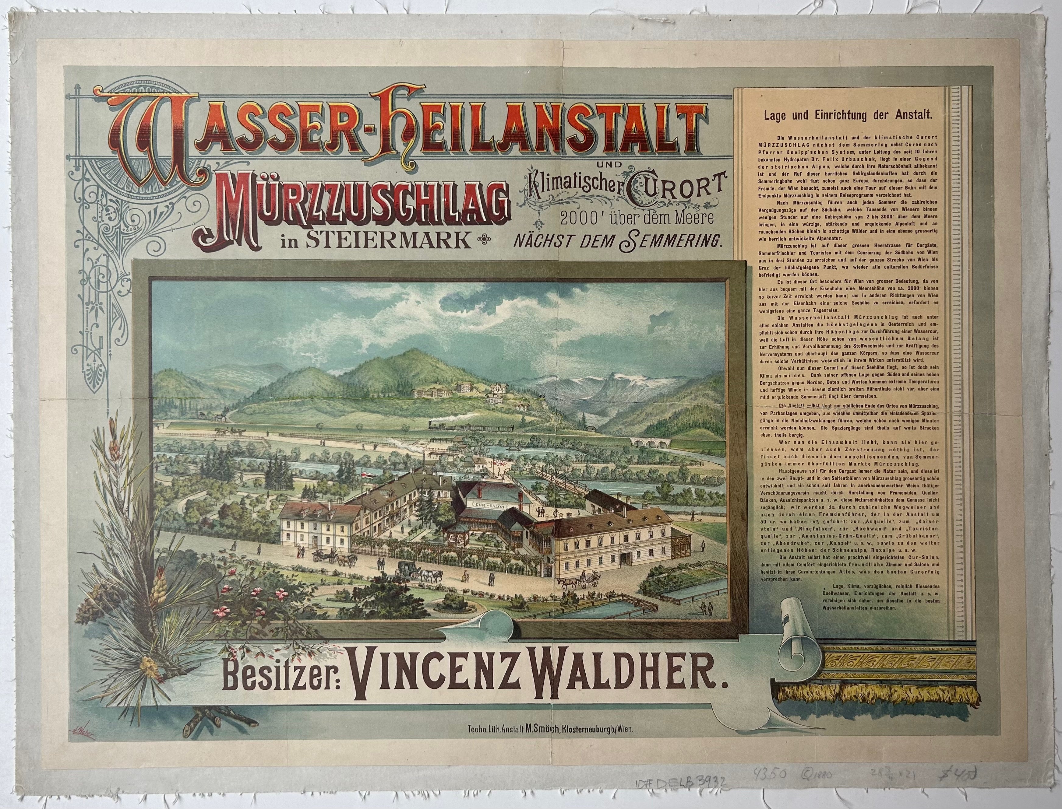 Original vintage Austrian poster advertising a spa retreat in Murzzuschlag, the capital of the Styria region. The poster illustration displays the sanatorium in its full, luxurious glory.