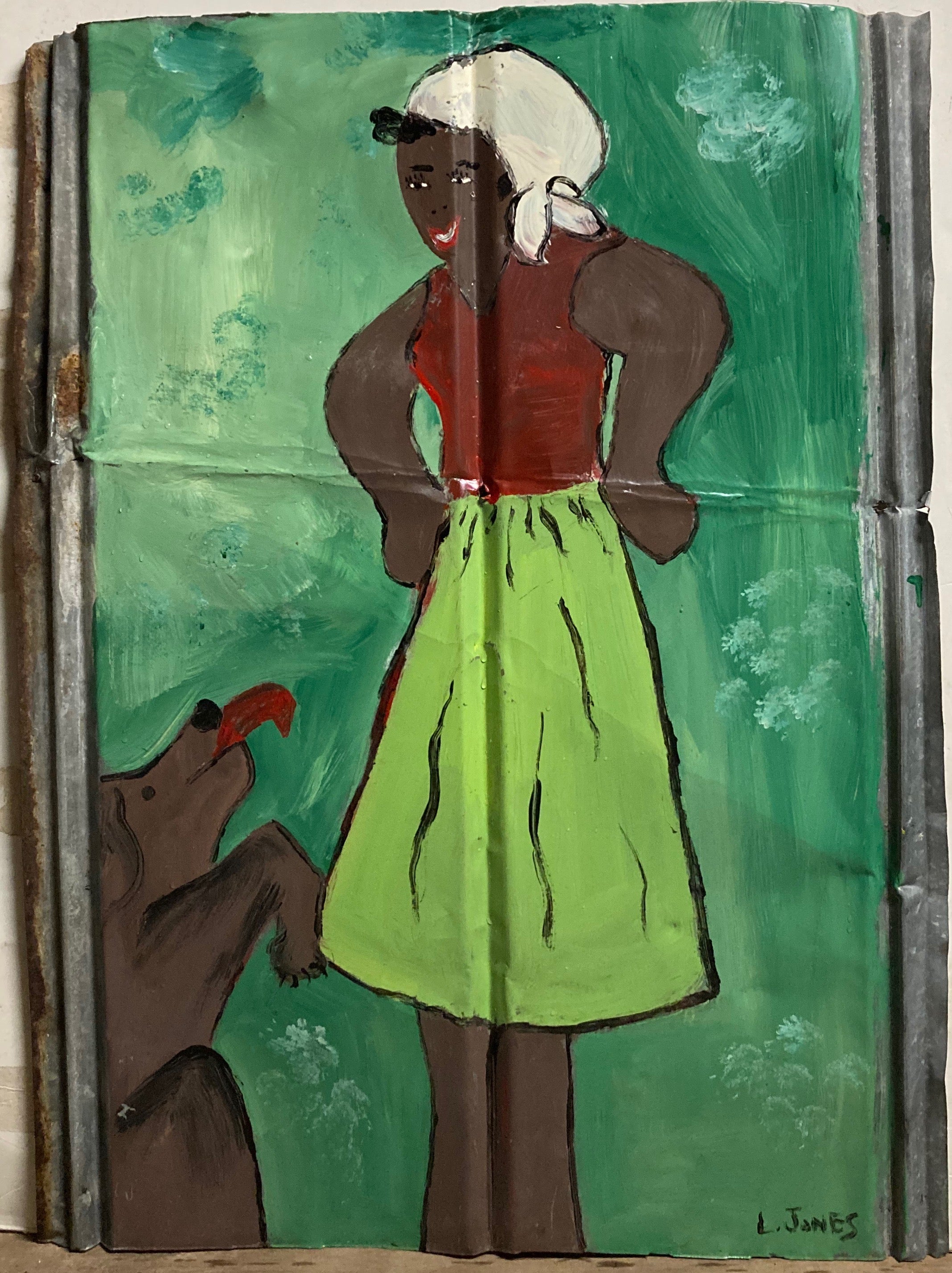 A native Georgian, Leonard Jones taught himself to paint when he was in high school. His works are greatly inspired by scenes from his childhood, images of rural living in the South including housewives, church-goers, and laborers. A folk artist who is often considered an outsider, Jones paints to capture candid daily life and the beauty found in the community around him.The use of scrap wood or tin roofing alludes to the buildings he grew up with, and he often incorporates these materials into the paintings themselves. The materials are covered in bold backgrounds of color, which Jones paints subjects over using his fingers or the handles of brushes, leaving a distinctly Leonard Jones work of art.