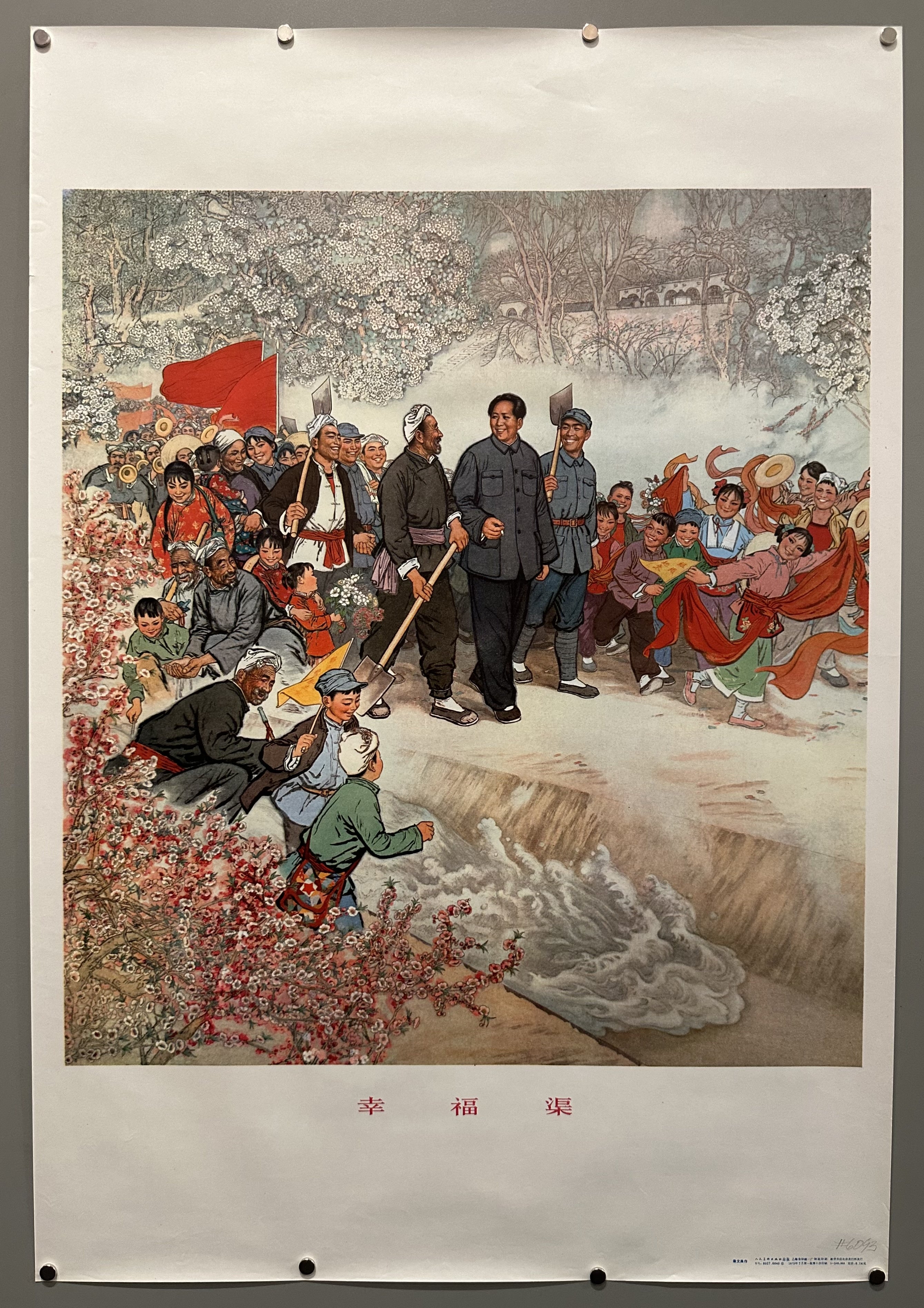 Chairman Mao walks with his consituents on a snowy path in this Chinese propaganda poster.